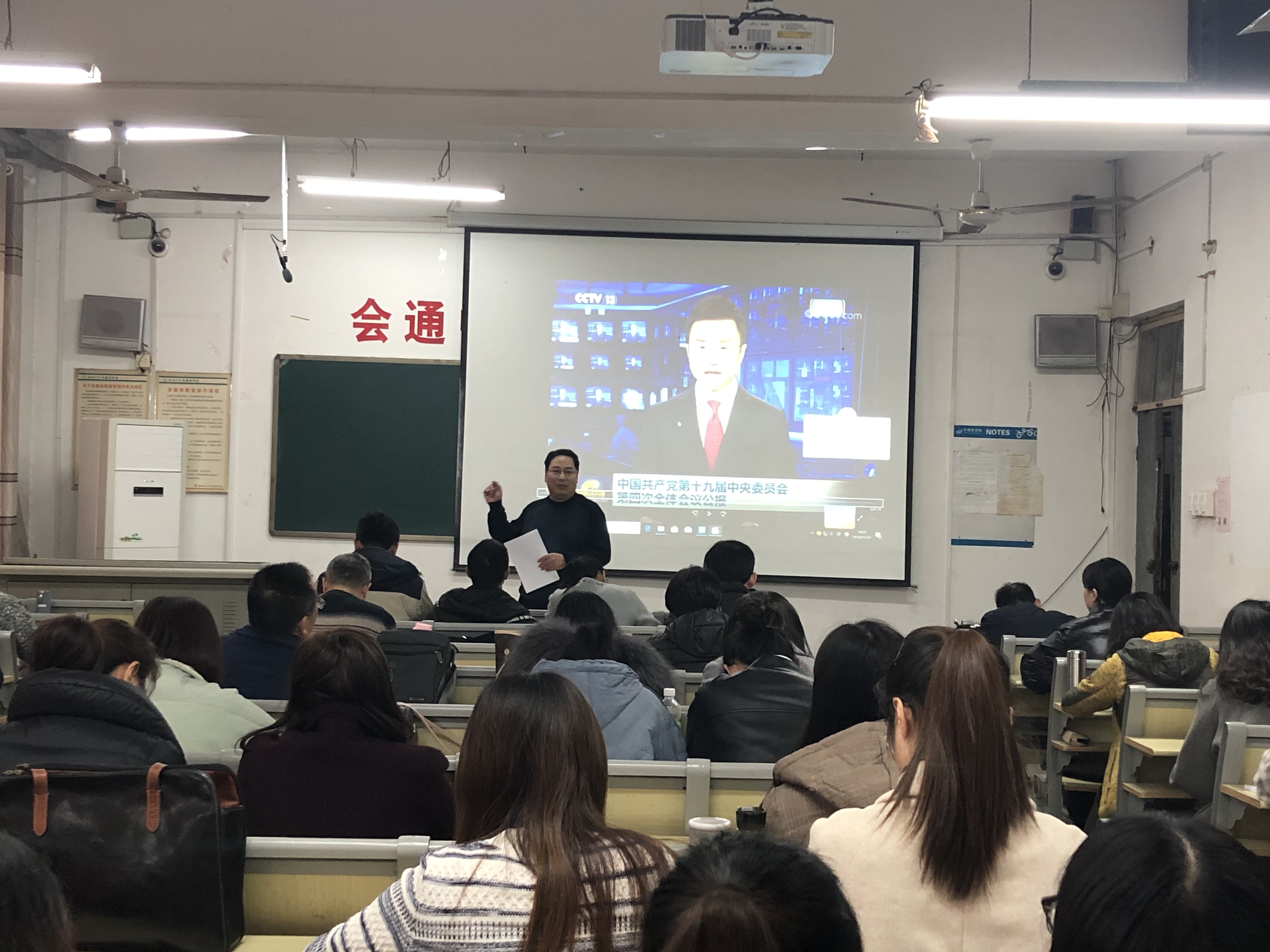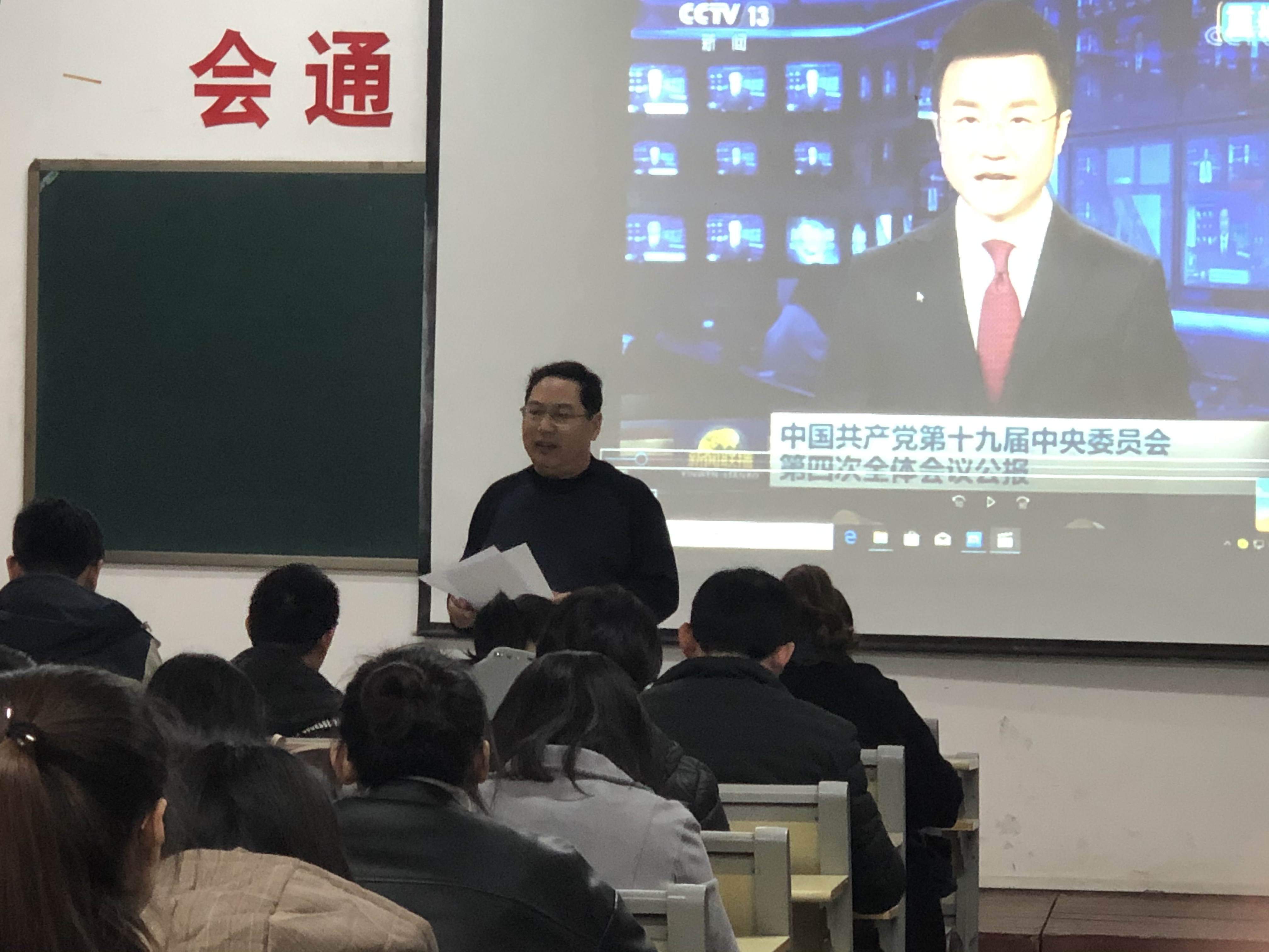 齐登红书记首先向全体党员大体介绍了刚刚闭幕的党的十九届四中全会的基本情况,接着大家集中观看了中央电视台新闻联播全文播报的《中国共产党第十九届中央委员会第四次全体会议公报》。视频观看完毕后,又通过领读领学的方式开展了学习,党总支书记齐登红、各支部书记分别进行领读,详细学习了《党的十九届四中全会(决定)学习辅导百问》。