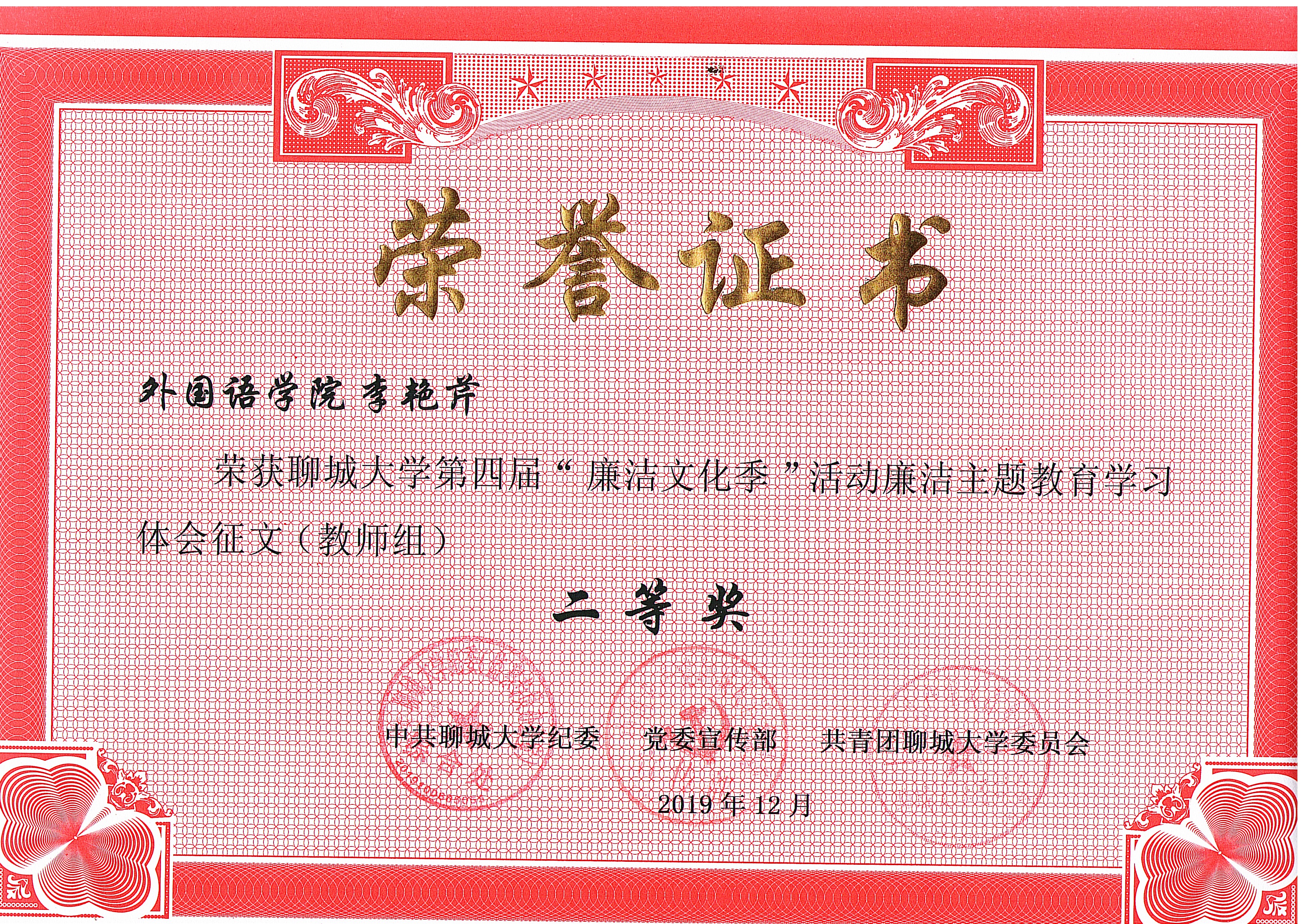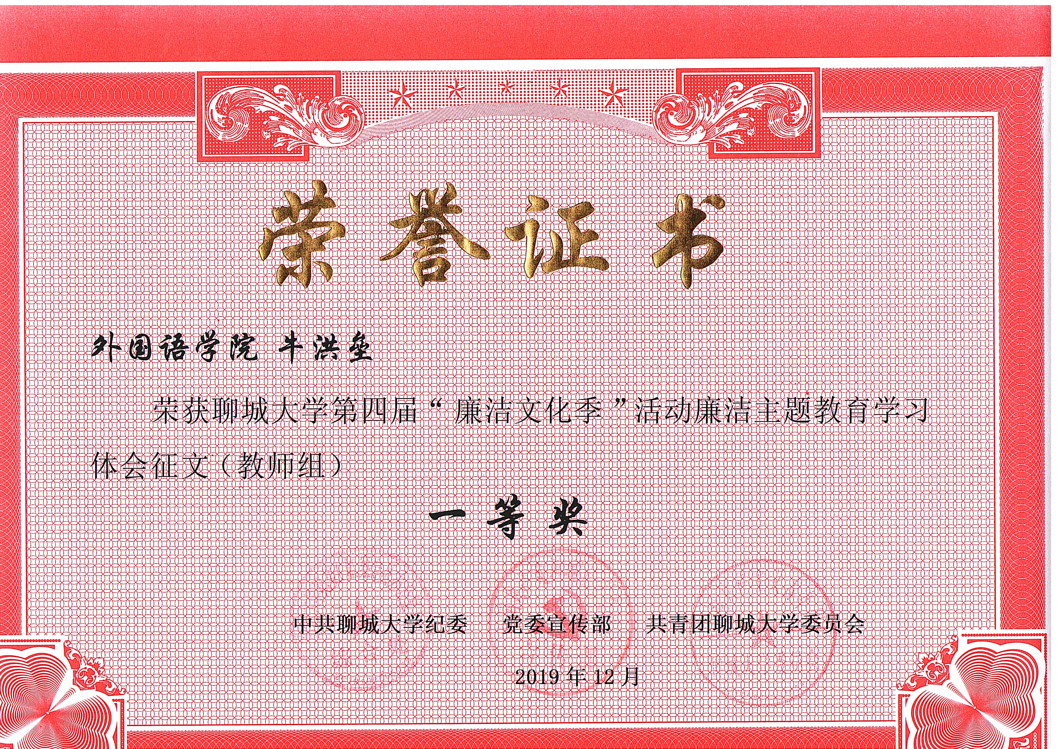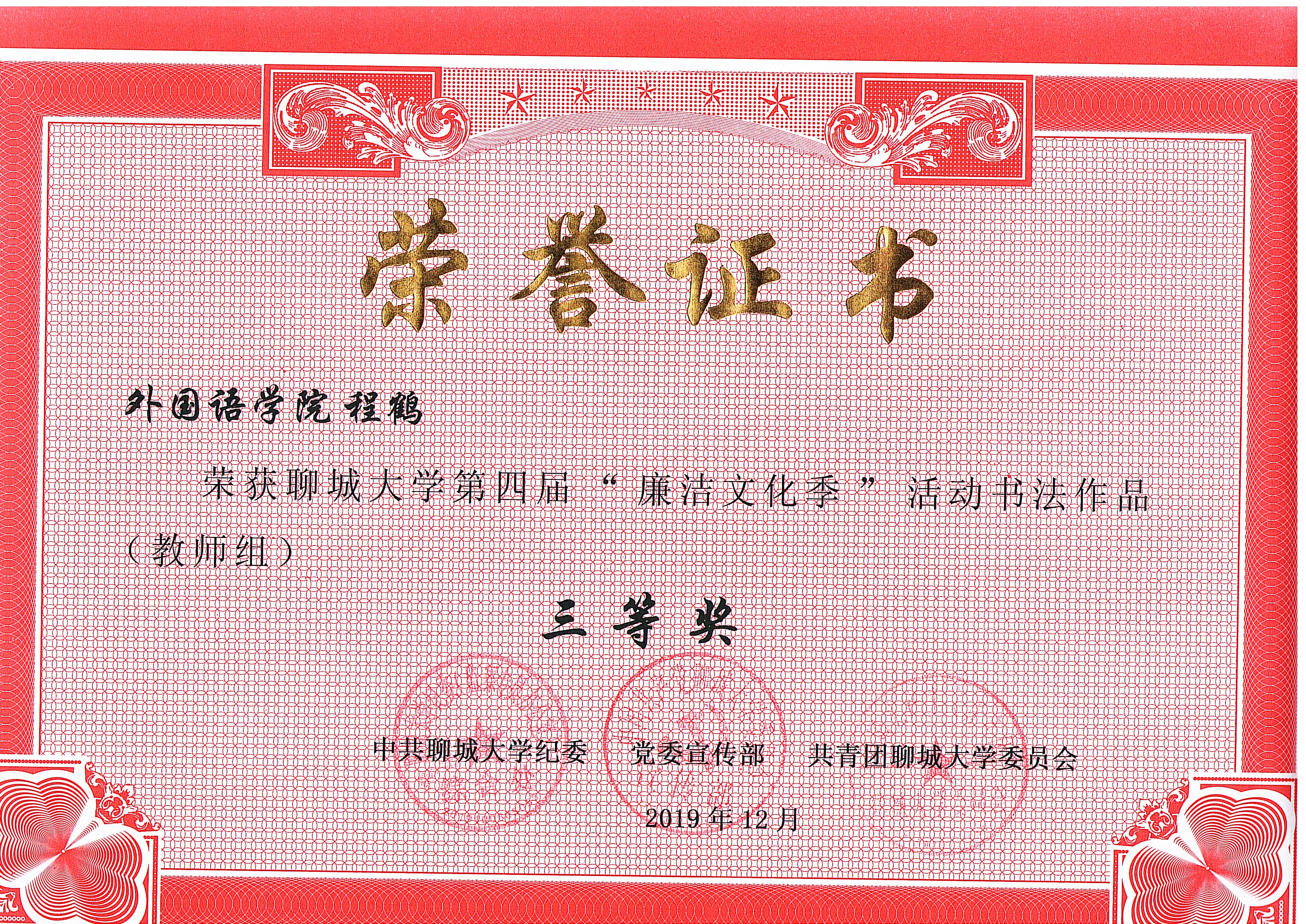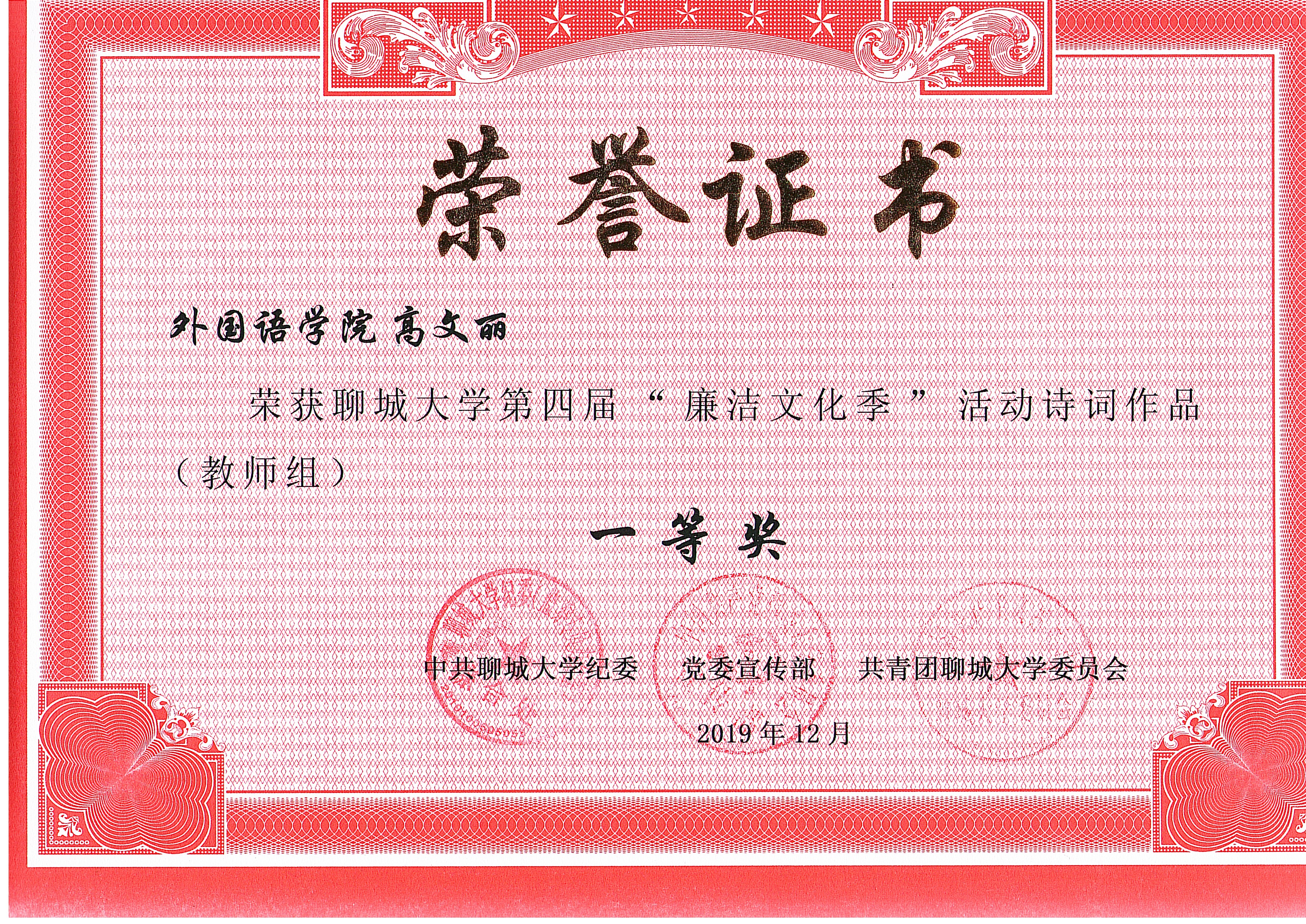 在公司举办的第四届“廉洁文化季”活动中,公司教师获佳绩。其中,高文丽获诗词作品一等奖,牛洪垒获廉洁主题教育学习体会征文一等奖,李艳芹获廉洁主题教育学习体会征文二等奖,程鹤获书法作品三等奖。