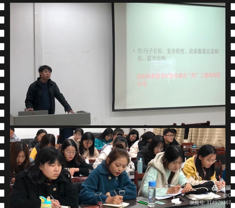 紧接着,孟令新副教授结合自己在翻译方面积累的丰富经验,用大量生动鲜活的案例从“音、形、义”三方面为同学们讲解分析了同构的观测。音,即语音。例如沙发sofa,孔夫子Confucius,功夫Kung Fu等,这些翻译不论发音、语音结构还是意义,原语与译语相似度都极高,可谓音形义俱全,所以同构程度较高。西方一些语言同根同源,容易满足音的对等,但英汉语言之间差异较大,音很多时候无法保全,所以译者只能退而求其次,保全形和义。其次,形则是句子长短、复杂程度、段落数量以及衔接、篇章结构的对等,但语际转换很难在“形”上做到高阶对等。英文重形合,中文重意合,英语中连词是句子的粘合剂,且规则约束性强,而中文是逻辑语言,“意尽为界”,弹性大,句界模糊,所以在翻译过程中要有意识地将连词等翻译出来,以满足形的对等。最后,义,即语义、正式度、文化以及语言的社会功能。比如中国人见面打招呼习惯问“你吃了吗?”此时不能译为“Have you eaten?”而要译为“Good morning!”,该翻译的形式损失了,同构程度降低,但是社会功能得到保留。同构易观测,但实践起来很难,最高等级的功能对等(同构)就是化境。最后,孟令新副教授认为科学的理论对实践具有积极的指导作用,他建议同学们要先学理论再实践,并尝试使用习得的理论解决翻译实践过程中遇到的困难。听着他深入浅出的讲解,在座同学们都频频点头,受益匪浅,对翻译中的同构现象有了更深刻的理解。