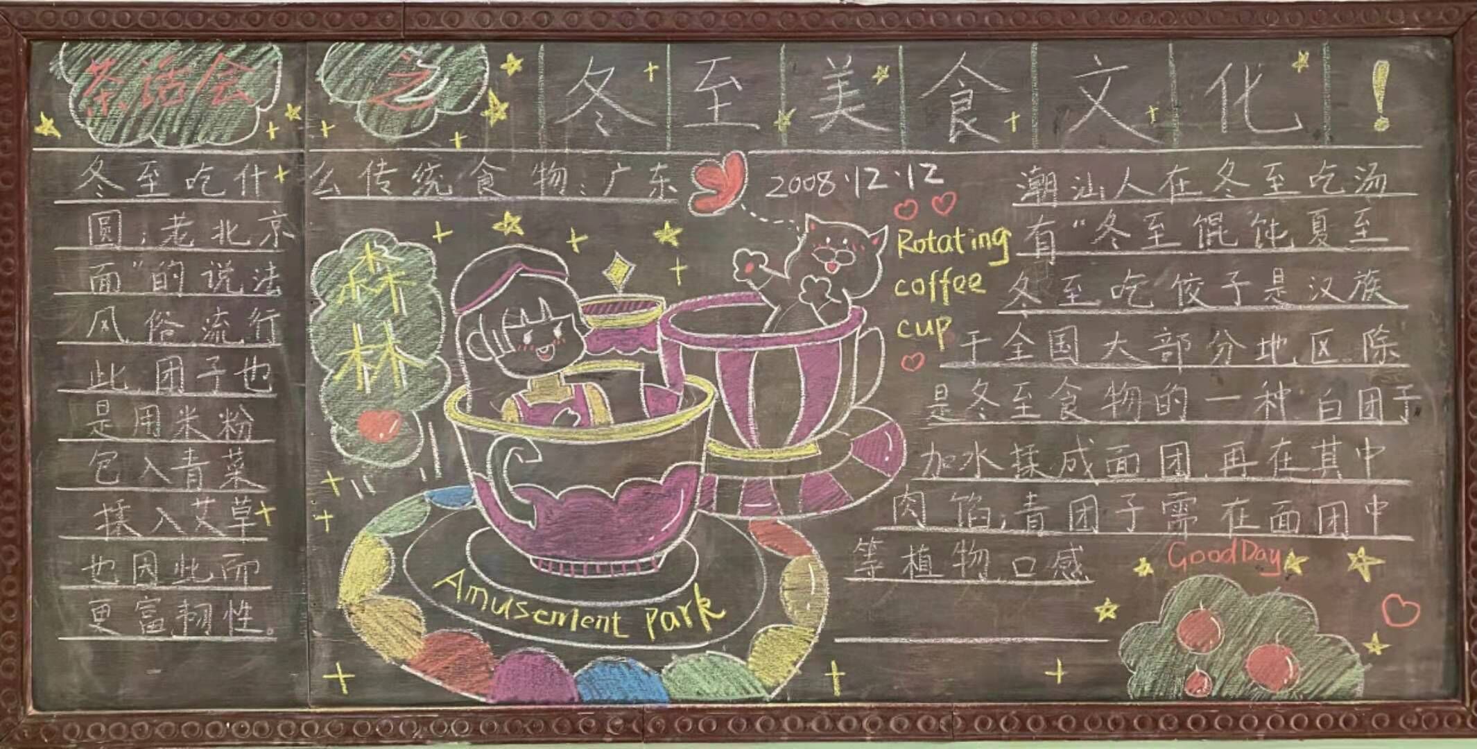 此次黑板报布置意在增加同学们对冬至的了解,宣传冬至美食文化,了解各地不同风俗,宣扬我国的传统文化。