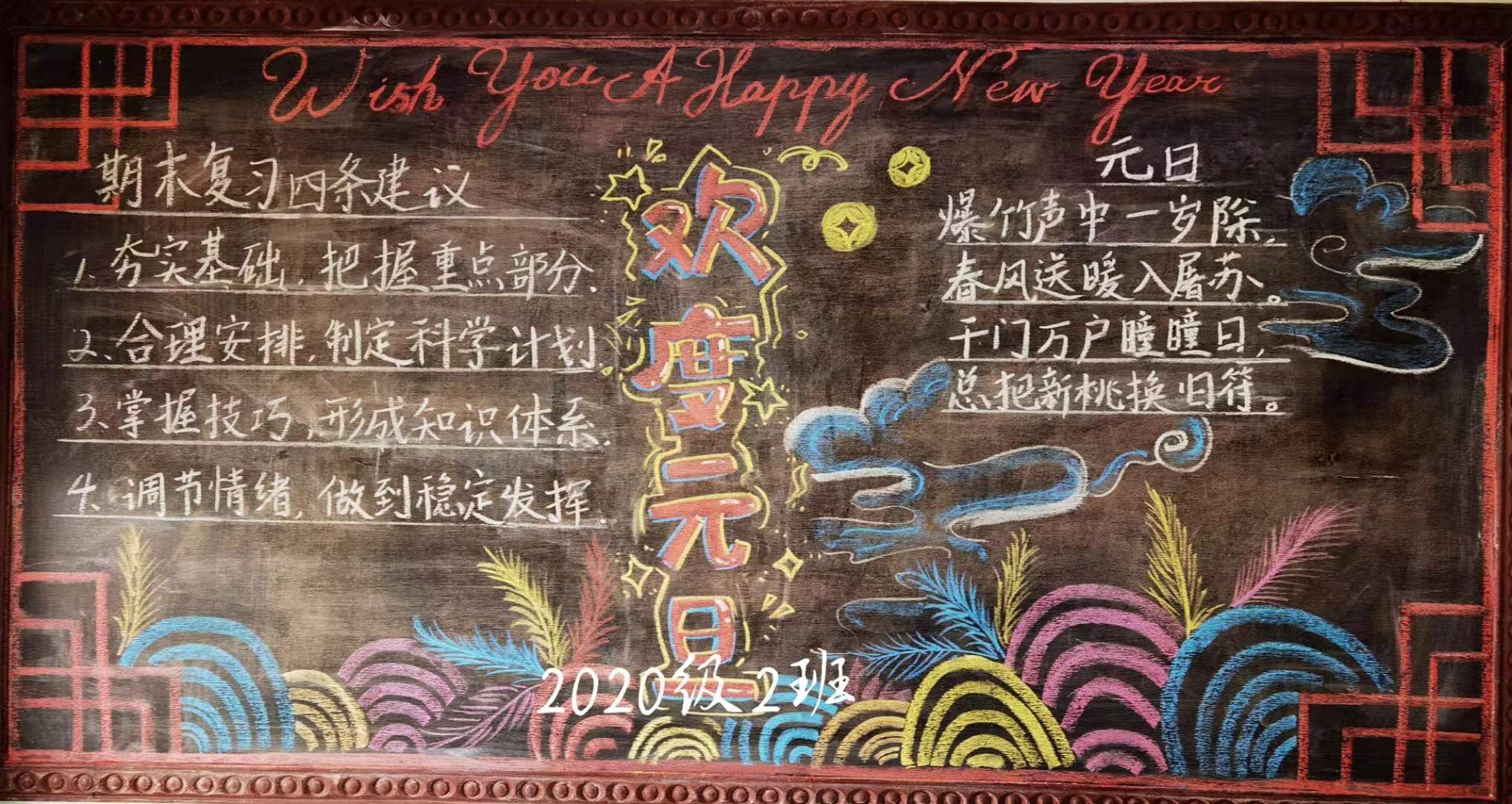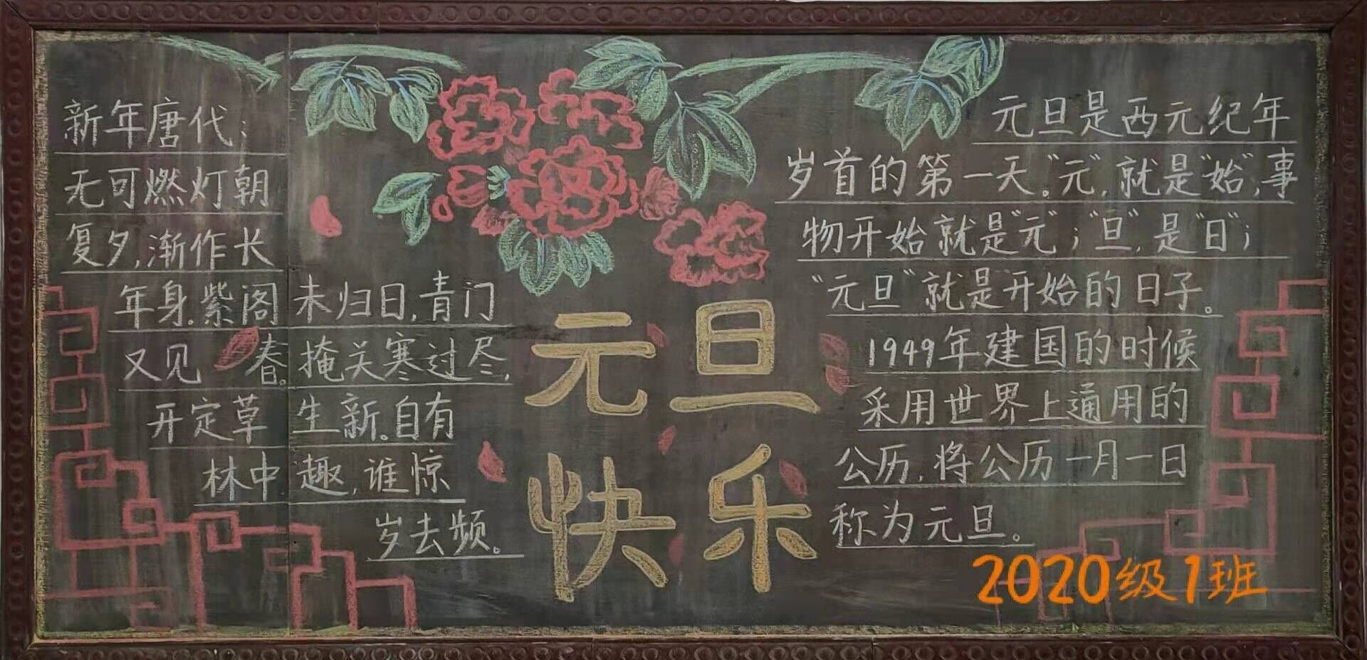 爆竹声中辞旧岁,粉彩之下迎新年。同学们充分发挥自己的聪明才智,利用课余时间搜集资料,认真设计制作,创作出一幅幅优秀的板报作品。这些板报作品或配图精美,或排版活泼,或板书整齐,不仅体现了古代的诗情画意,而且融合了现代的创新元素,每一幅作品都能让人感受到元旦的氛围。