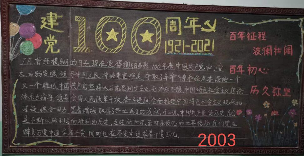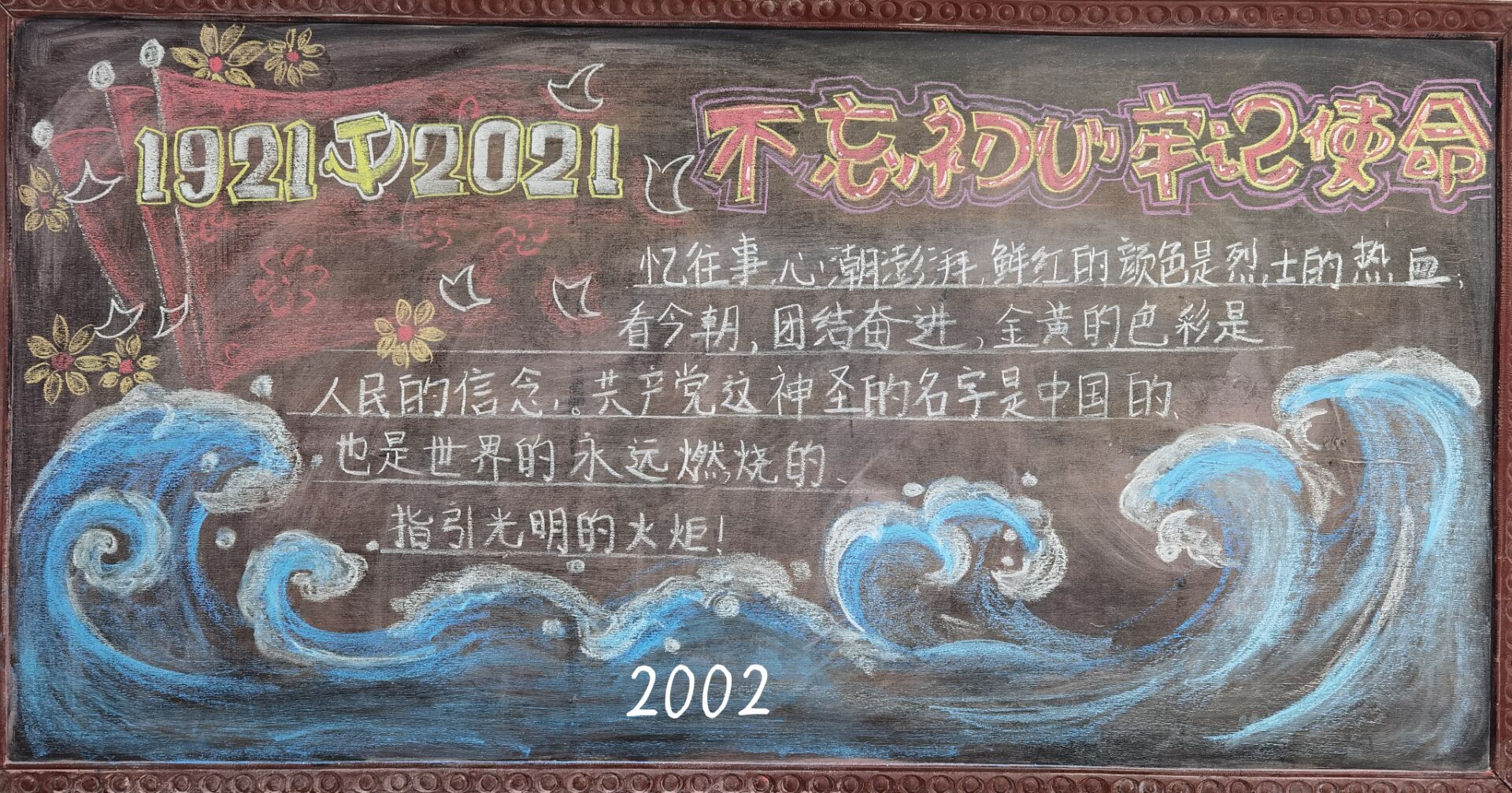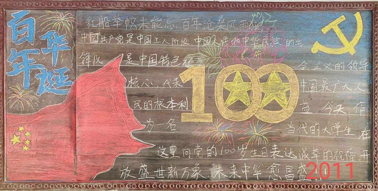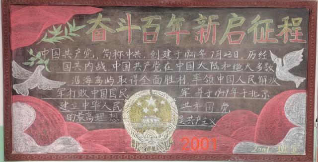 红船举帜不能忘,百年沧桑风雨狂。在党还没有成立之前,中国仍然处于一片黑暗,自党诞生以来,中华大地升起了太阳,照亮了黑暗,驱散了迷雾,从此中国走向富强。2021年是中国共产党成立100周年,同学们认真回顾了党的建设历程,将自己对党和国家的热爱融入板报创作当中。