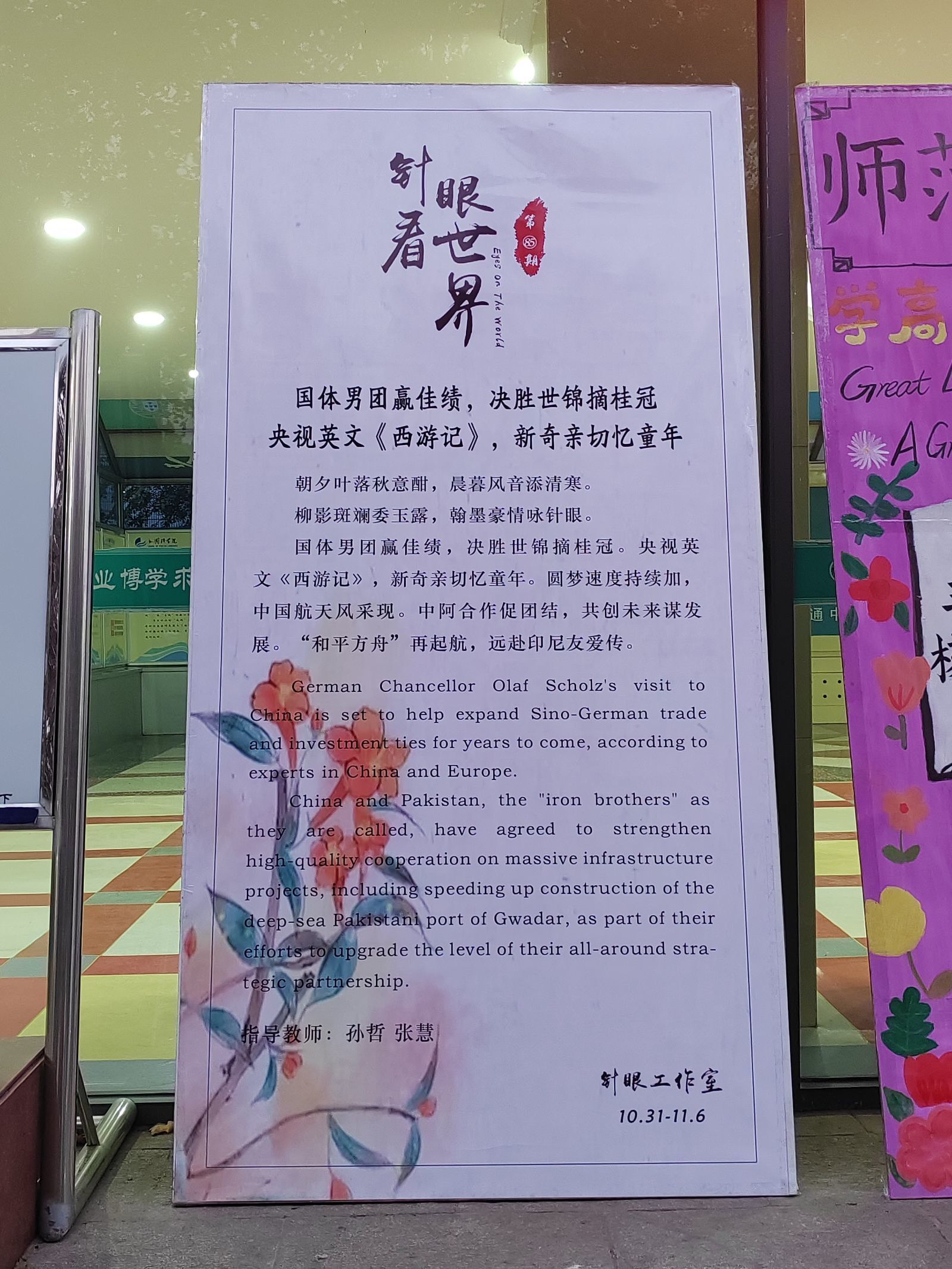 国体男团赢佳绩,决胜世锦摘桂冠。央视英文《西游记》,新奇亲切忆童年。圆梦速度持续加,中国航天风采现。中阿合作促团结,共创未来谋发展。“和平方舟”再起航,远赴印尼友爱传。