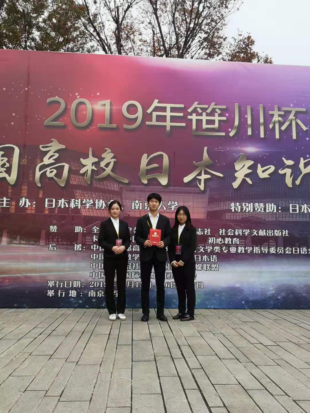 11月16日,由日本科学协会与中国内地大学共同主办,旨在加深中国青年对日本的了解、激发日语学习热情、促进两国青年交流的“2019笹川杯全国高校日本知识大赛”在南京大学举办。本次大赛共有114所高校、400余名师生组队参赛。公司mk体育日语系2017级6班王潇庆、鞠冰,7班王咏雪同学由日语系金玉兰、外教小松一幸老师带队,代表mkmksport参赛。