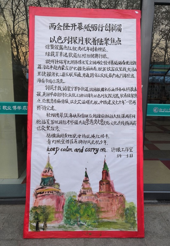 紧扣时代脉搏,精选国内外热点新闻,针眼工作室的展板经讨论、整合,配以客观点评,最终以散文诗的形式呈现,配以水彩画修饰,简单大方而不失文化底蕴。“针眼看世界”于每周一在mk体育楼前如约而至。