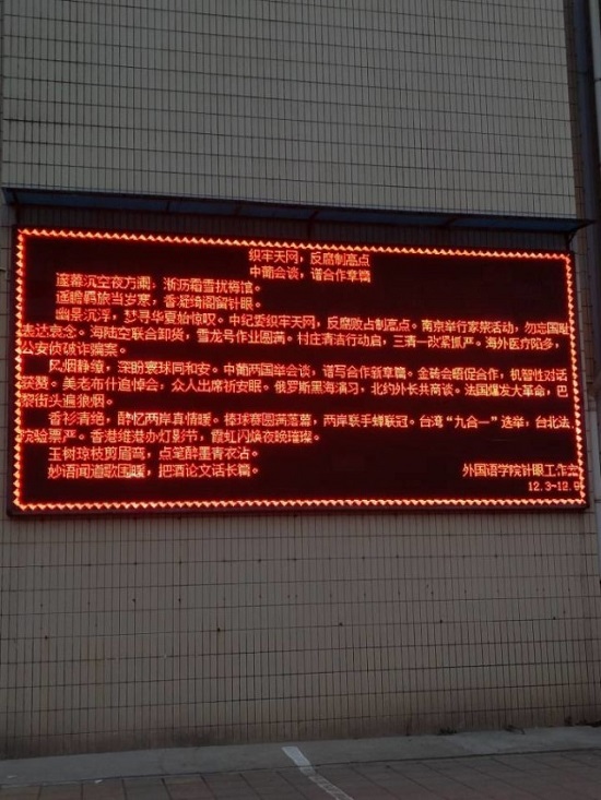 多元呈现,不断发展。除展板外,“针眼看世界”还在聊老员工工作处的东西校LED屏上向全校员工展出。文字之力于荧屏之上凸现,新闻之风于校园之间流传。针眼志在向全校师生传播本周新闻,呼吁更多人关心时政热点、把握时政潮流。