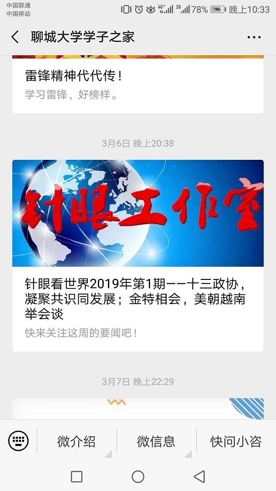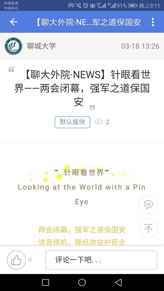 时至今日,又拓新篇。今年,是针眼工作室具有历史意义的一年,工作室登入聊大学子之家公众号,通过更大的平台,为全校师生乃至社会各界开启时政之窗,引导正确舆论风向。