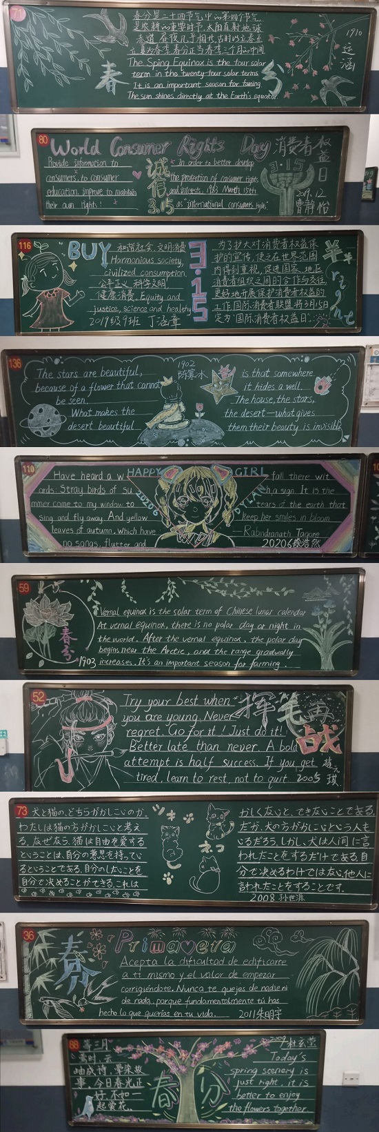 同学们以春分、好书推荐、消费者权益日为主题进行创作,黑板报插画多彩精美、紧扣主题,文字工整,排版清晰美观,经过负责小组评比打分,评选了出众多优秀黑板报。其中,19级10班运涵同学以柔和的笔触勾画出依依杨柳和可爱的春燕,展现出三月的温暖与生机勃勃,20级6班徐浩然同学以一幅色彩鲜明的卡通女孩插画,彰显出青春活力。