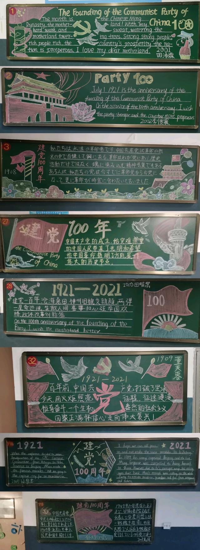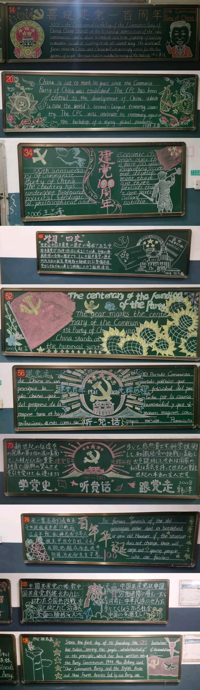 活动中,各班同学精心准备,紧紧围绕主题收集资料,潜心编排。参评的黑板报内容充实、主题鲜明、布局美观、版面新颖、图文并茂,其中,19级4班王蕾同学通过柔美的线条,生动的艺术字表现出对党的敬爱;20级1班田沛霖同学通过甜美可爱的卡通形象、红黄的鲜明色彩展示出同学心目中党的光辉;20级5班赵言同学运用充满热情,朝气的向日葵表达了对党的美好祝愿。经过评比,19级3班牟佳、19级4班王蕾、19级8班任可盈、20级5班赵言、20级10班马敏等10位同学的黑板报脱颖而出,被评为优秀板;20级1班田沛霖、20级2班李俊霖、20级10班田智慧等8位同学被评为标兵班。