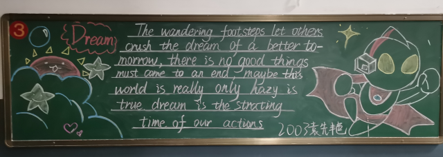 本次板报的主题是梦想,今年是建党100周年,每个人都不应该忘记自己的初心和使命,而梦想是我们前行的指明灯。本板素材主要由云层,太阳,星星,奥特曼和英文组成,这些元素基本都象征光,乌云表示正处于迷茫时期的人们。不要让别人徘徊的脚步踩碎你明天美好的梦想,前途光芒万丈,你应该拔开迷雾,明确自己的梦想,有了梦想就有了光,光会照亮你前进的路。
