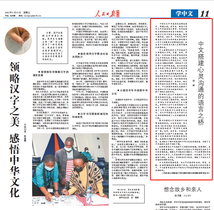 6月24日,公司副经理刘宾撰写的文章“中文搭建心灵沟通的语言之桥”,在《人民日报》第11版“学中文”发表。文章阐述了中文教育在太平洋岛国的现状以及对中国与太平洋岛国命运共同体构建的重要意义。