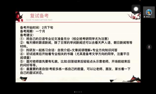 为进一步做好2019级考研复试辅导工作,帮助员工合理科学备考,3月18日晚6点30分,mk体育日语系开展了线上考研复试经验分享会。本次分享会由日语系2020级员工姜顺华主持,系主任林娜、副主任陈远春出席,日语系2018级7位成功上岸的优秀学子做经验分享,2019级及其他年级部分员工参加。