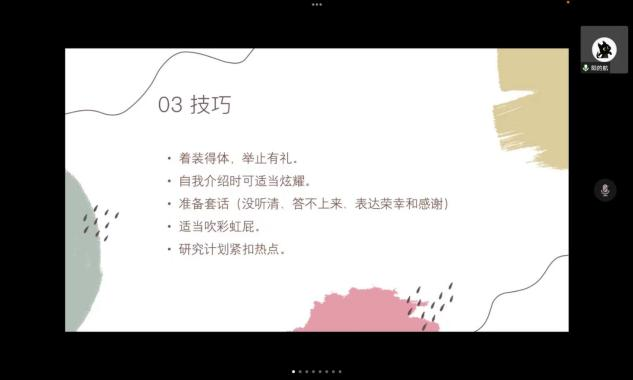 本次分享会从一志愿录取和调剂录取两个方向进行了介绍。7位学长学姐通过PPT的形式依次分享了复试经验,涵盖了基础知识的准备、相关信息的获取、复试时的方法和技巧、以及心态等方面的内容。他们结合自身经历,详细讲解了备考期间应注意的问题,耐心解答了学弟学妹们的疑惑,使他们对即将到来的复试有了一个更具体、更清晰的认识。