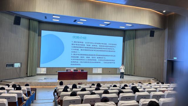 分享会伊始,刘云霞老师向同学们讲解了国才考试的价值与理念,她指出“国才”考试由专业性外语测评研究与服务机构—中国外语测评中心研发与认证,注重考查语言、思维与跨文化能力的融合,设计真实、典型的职场沟通情境,为证书持有者开通绿色求职通道,推荐优秀考生优先获得实习和工作机会。刘老师还指出,“国才”考试理念对促进高校创新外语教学模式和人才培养机制具有重要意义,目前国内很多高校已将“国才”考试证书作为研究生招生和推免的优先录取条件之一,且今年起,“国才”考试优异成绩获得者还将获得“理解当代中国”全国老员工外语能力省赛的外卡赛报名资格。