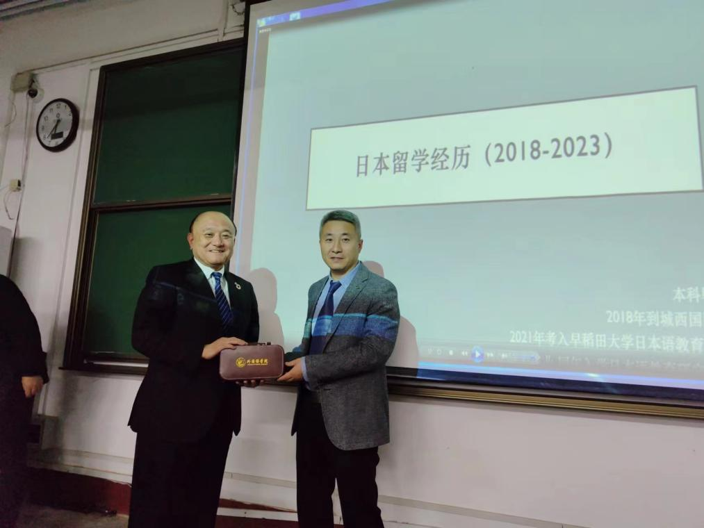 讲座开始,仓林真砂斗董事长为同学们讲解了加强对不同文化差异的了解的重要性,给同学们打开了新视角,激起了同学们对留学项目的兴趣。随后,宫伟老师详细讲解了日语专业的发展前景,向同学们细心介绍了城西国际大学的基本情况,包括公司的地理位置、留学相关事宜、往届留学的学长学姐等,使同学们对本留学项目有了基本了解。最后,宫老师鼓励大家不仅要能“引进来”,更要能“走出去”,眼光长远,学好专业基础知识,培养过硬专业素养,在交流中走向国际大舞台。