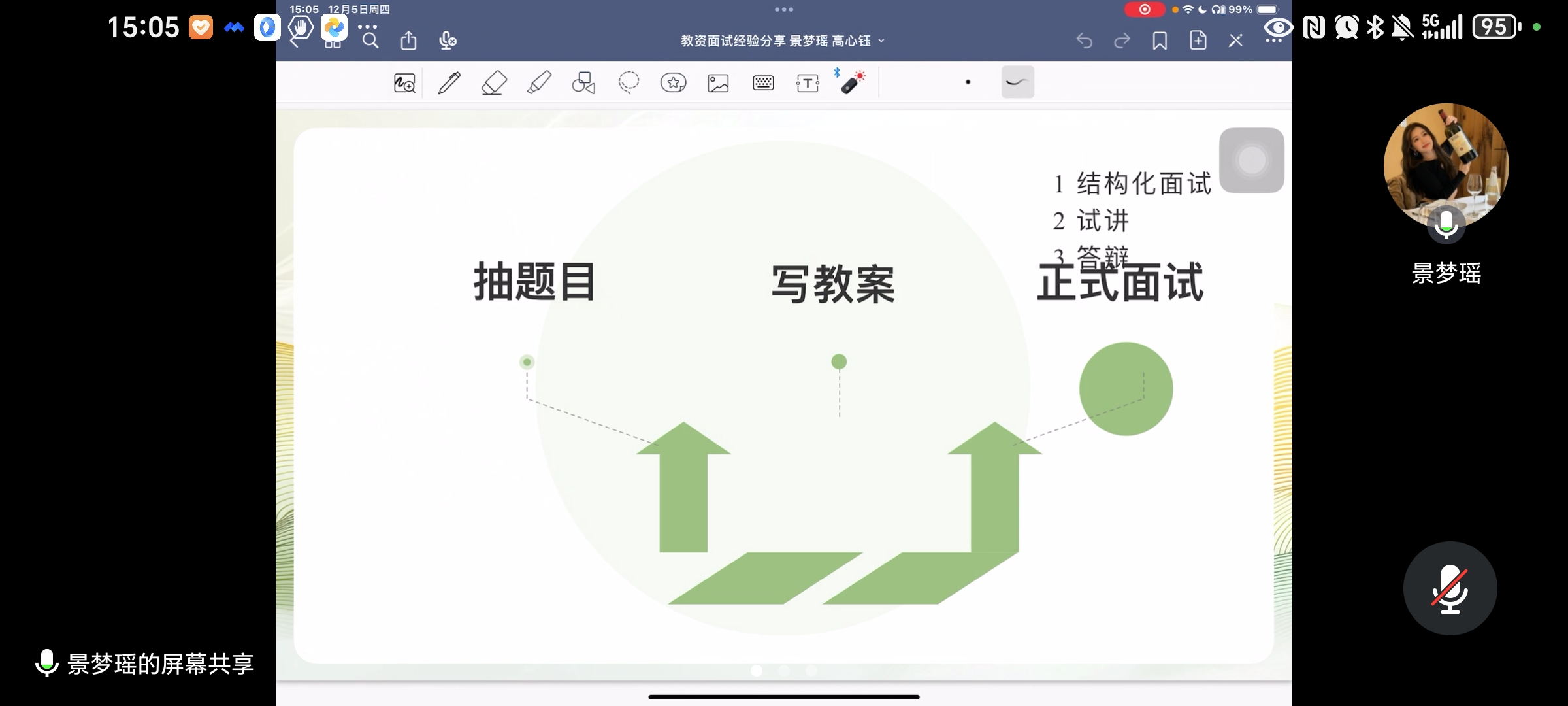接着,高心钰分享了面试中结构化面试和答辩部分的相关经验。高心钰指出,进入教室之后,大家应尽快平复心情,不要过度紧张。结构化面试是用中文回答,所以不必过于担心。然后分享了几个结构化面试的问题。答辩内容分为两种:1.个人情况,比如为什么想成为日语老师?2.专业知识,比如为什么试讲中没有讲到划线句子?