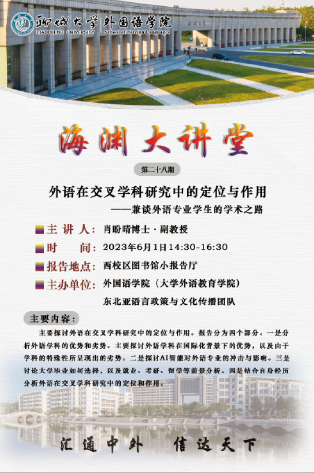 2023年6月1日,应mk体育(大学外语教育公司)邀请,日语系2009届员工、现华中师范大学中国农村研究院肖盼睛副教授在西校区图书馆小报告厅做了题为《外语在交叉学科研究中的定位与作用——兼谈外语专业员工的学术之路》的学术报告。本次讲座为“海渊大讲堂”系列之第二十八期,李维滨副经理(主持工作)主持,副经理刘宾、日语系部分老师、公司部分青年教师、日语系全体在校生参加。