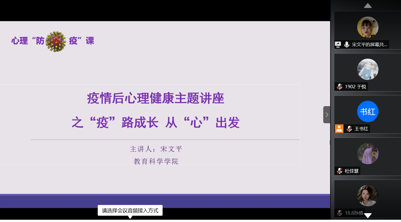 为使同学们能够更好的体验讲座,受邀心理讲师宋文平学姐采用了直播会议的讲解方式。讲座从疫情入手延伸至各类有关心理方面的解读。宋学姐先是为大家列举了面对疫情同学们有可能遇到的心理问题,并一一给出解决方案,以供大家针对自己的情况进行疏解,以积极的心态面对疫情。疫情带来的影响并不是单一的。面对网课等学习压力,学姐同样为同学们准备了一系列方案,从确立目标到制定计划,从自治自律到适当放松,这不仅让同学们意识到了学习是一件无关时间地点的长久之事,也让同学们学会了如何缓解压力,做到健康生活。针对同学们较为关心的开学问题,宋文平学姐分别从不开学和开学两处总结情况,告诉同学们无论开学与否都要学会适应,化解困难。讲座最后,学姐带领同学们一起互动,鼓励大家积极发言提问,并仔细耐心地给出解答,为同学们解决了心理难题,疏通障碍。