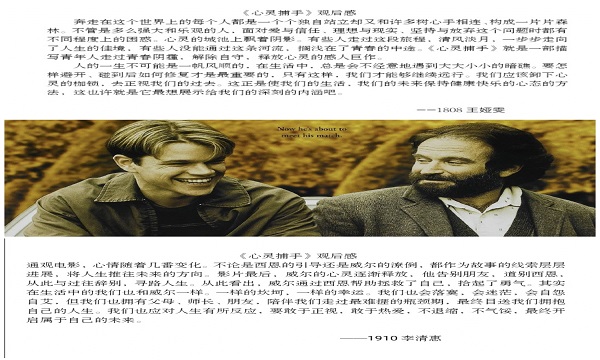影片以主人公威尔对心理治疗的心理路程为主线,详细讲述了威尔在一位事业不太成功的心理辅导专家桑恩教授的努力下,两人由最初的对峙转化成互相启发的友谊,从而使威尔打开心扉,走出了孤独的阴影,最终实现自我。观影期间,同学们认真体会了人物的每一个细节、动作以及心理变化,与剧中的人物在心灵和情感上产生了共鸣,同时在与主人公威尔的内心相碰撞的过程中,受益匪浅。从李清惠同学的“敢于正视、敢于热爱,不退缩、不气馁”的宣言中,开启属于自己的未来;从王娅雯同学的“卸下心灵的枷锁,正视自己的过去”的人生感悟中,走出青春的阴霾,释放蒙尘的心灵……