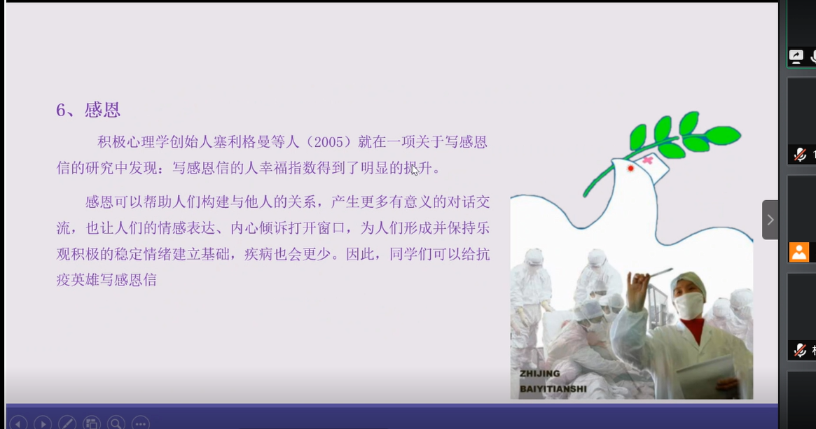活动发布后,同学们积极参加,并在活动前五分钟之内准时进入会议室。活动开始后,宋学姐首先通过疫情期间同学们难免产生焦虑、烦躁心理这一问题来引出本次活动的主题,随后根据“面对疫情怎样防护,培养积极情绪的原因和措施,返校复学心理问题调适指南,六个锦囊分享”四个方面的问题进行讲解。最后进入自由交流讨论环节,宋学姐针对同学们在聊天区提出的问题给予安慰和建议。