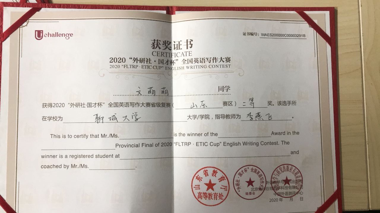 省赛阶段,三项赛事各有来自全省各院校的140余名选手参与角逐。写作大赛中,文萌萌(19级英语)、霍文慧(19级生科)在李燕飞和李坤老师的指导下分别获得山东省复赛二等奖和三等奖。