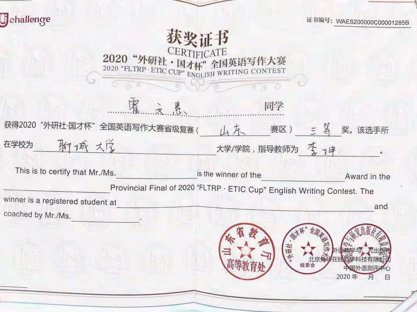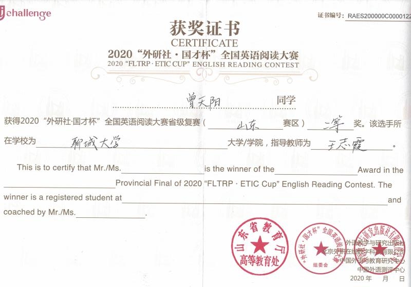 阅读大赛中,曾天阳(18级历史)、王宇(19级英语)在王志霞和王红霞老师的指导下分别获得山东省复赛二等奖和三等奖。