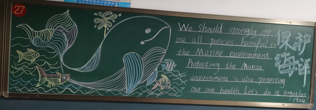 在开始画小黑板之前,我首先确定好了此次板报的主题——保护海洋环境。以蓝色为板面主要基调,配以红、黄、绿、白等其他色彩,展示了海洋世界的五彩缤纷与生机勃勃。