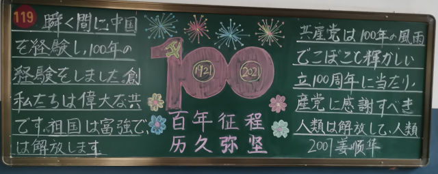 板报中央是中宣部发布的“中国共产党成立100周年庆祝活动标识”;下方是对党成立以来的总结:百年征程,历久弥坚! 100年的风雨兼程铸就100年的光辉历程,蓦然回首,岁月如歌,不禁令人心潮澎湃,感慨万千。愿中国共产党永远熠熠生辉!