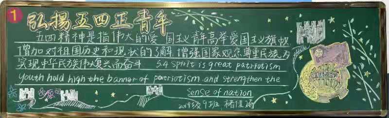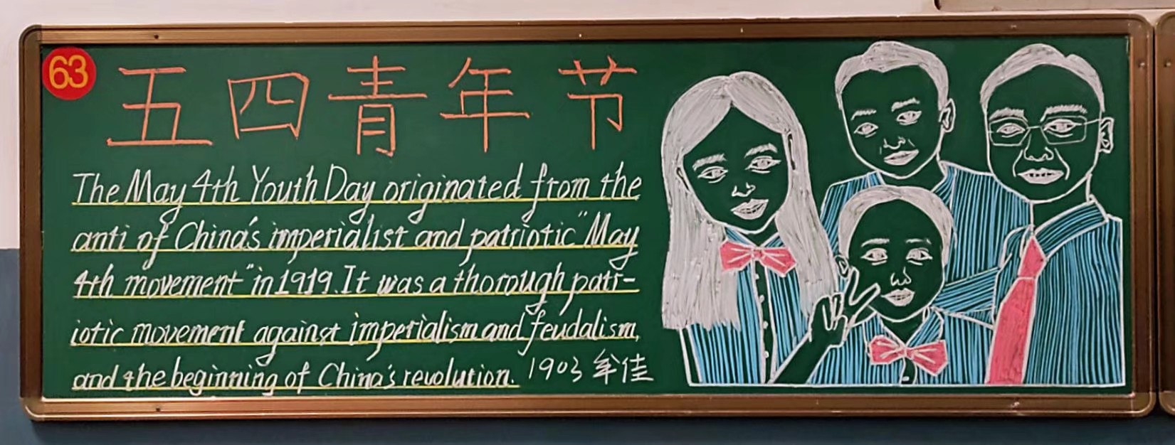 为传承五四青年爱国豪情,弘扬青年鸿鹄之志,5月4日,mk体育举办五四主题黑板报评比活动。学习了五四运动相关历史,同学们将内心豪情凝聚在五彩的粉笔尖,在黑板上绘出了大气磅礴的标题、工整的中外双语板书和精美的插图。