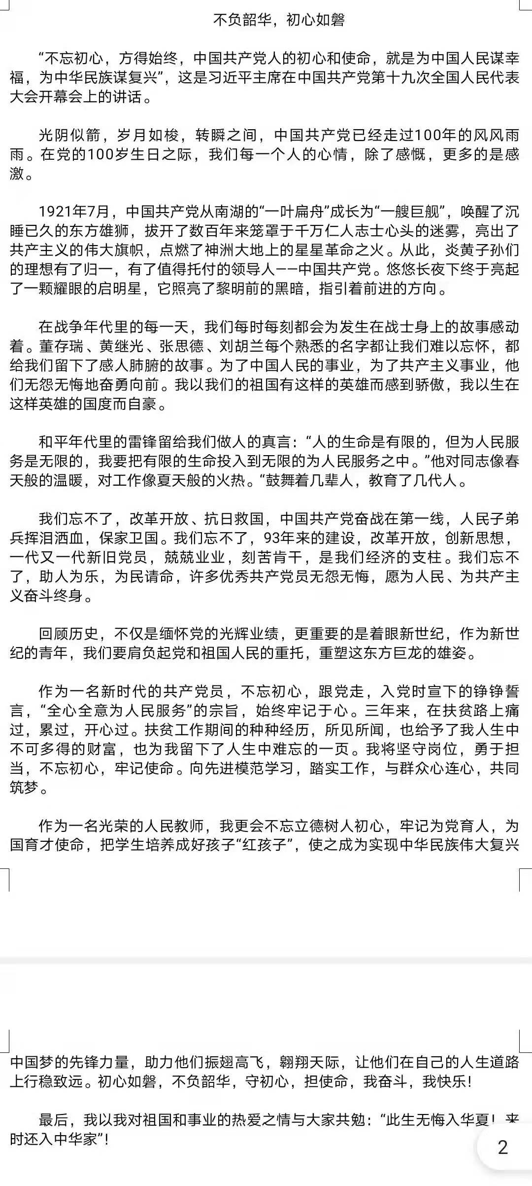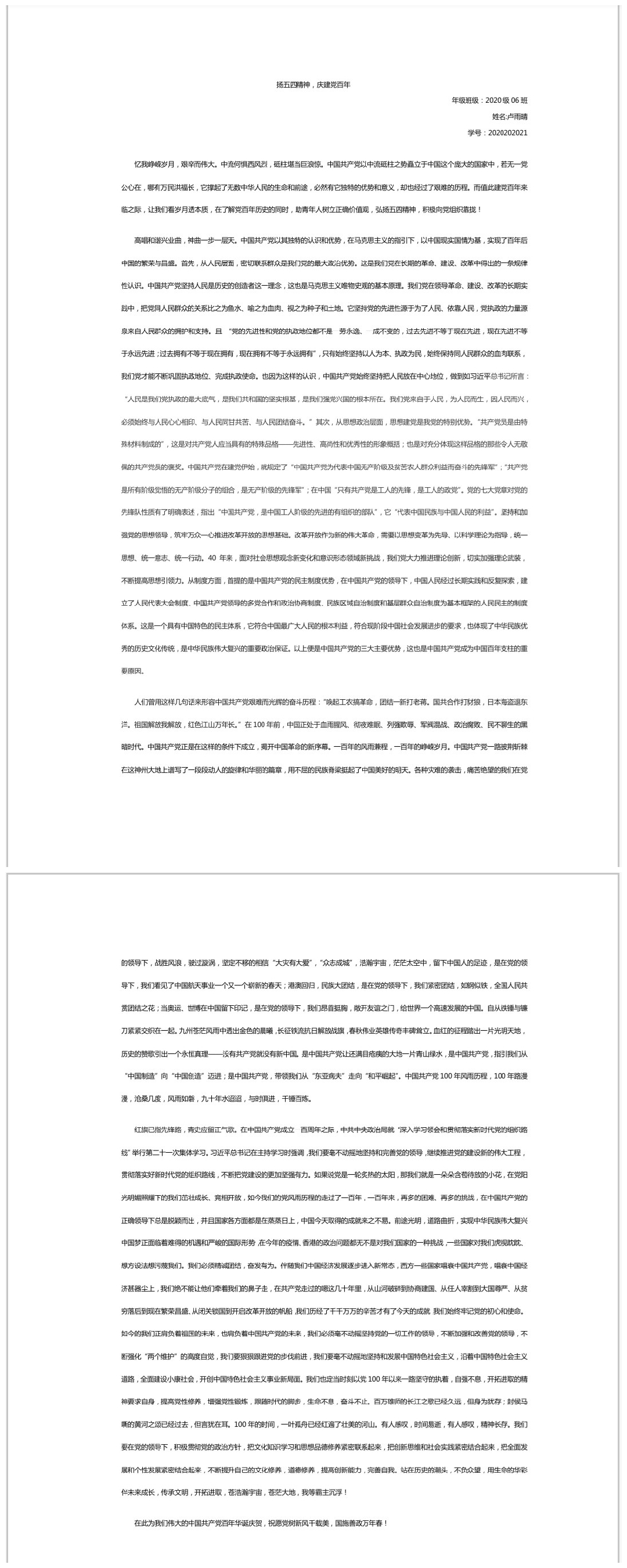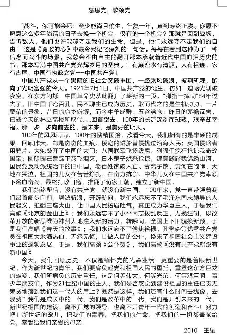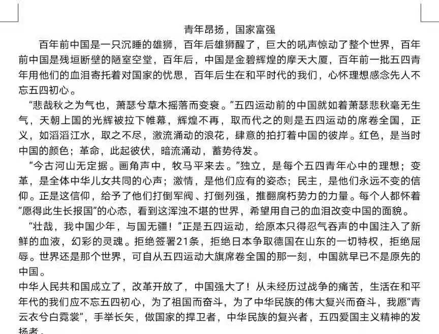 此次征文比赛受到了包括五六班团支部成员在内的同学们的积极参与,同学们紧扣征文主题,撰写文章,抒发自己内心的感怀,为庆祝中国共产党成立百年添上属于新青年的一笔。有的同学就人生观、价值观、世界观抒发自己对祖国的热爱;有的同学就人生信仰阐明五四精神的重要性;有的同学则就中国历史进程将中国历史生动形象地展现在作文中,不仅增强了同学们的爱国主义情怀,而且展现了当代青年的精神风貌。同学们以五四精神为主题,围绕建党百年来展现对祖国以及中国共产党的美好祝愿,体现新时代、新青年积极向上的生活态度。活动最后,同学们将作品交给活动组织者,由活动组织者将作品统一收齐保存,通过公平公正的评比,选出六个优秀的征文作品进行展览,供同学们分享和学习。
