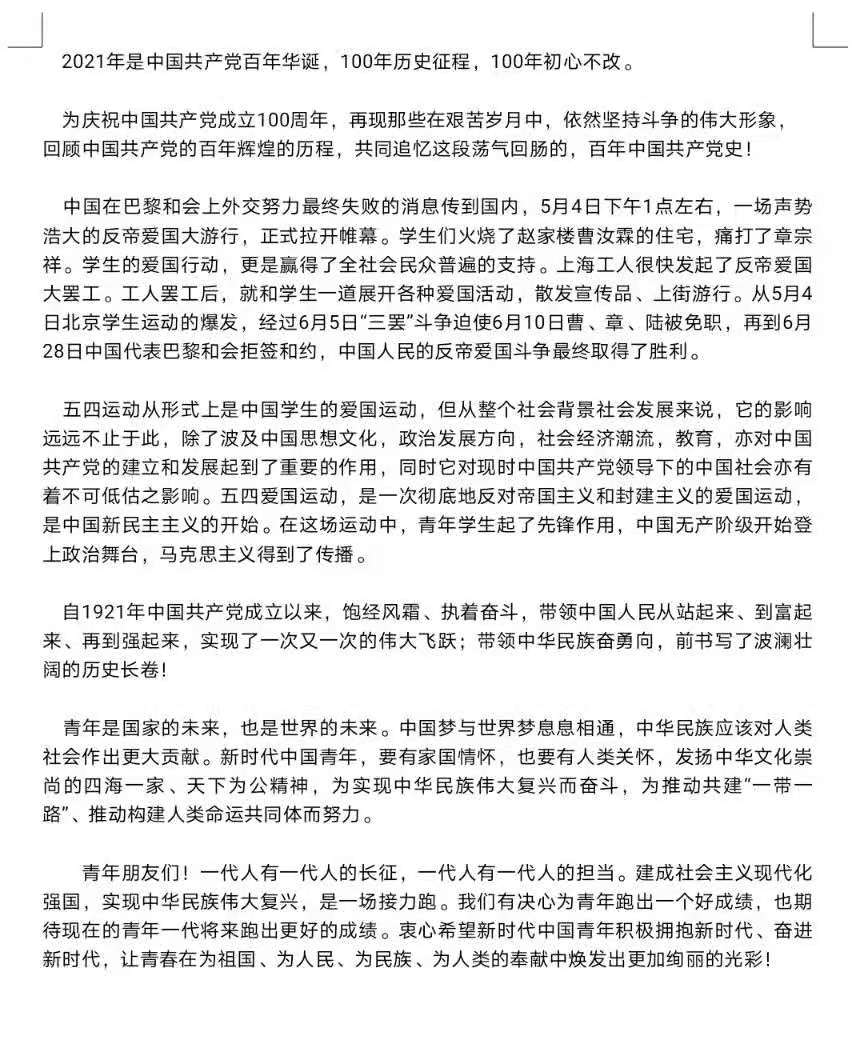 正值五四青年节来临之际,为表达中国新时代新青年对党和国家美好的祝愿,提升青年员工对国家社会的责任感、归属感,展现新时代新青年积极向上的精神风貌。5月4日,mk体育在线上举办“争做五四青年,共庆建党百年”征文活动。