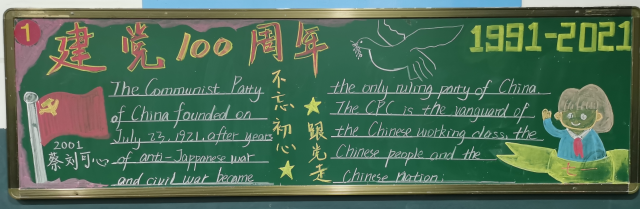 黑板报围绕建党一百周年为主题,故在黑板报左下使用了党旗这一元素来体现建党,右下戴红领巾的小女孩正朝党旗的方向行礼。右上“1921-2021”字样体现了建党一百周年。和平鸽象征着自由与和谐。不忘初心、跟党走的字样更加凸显了主题。