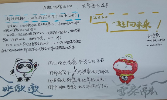 活动准备前期,活动负责人积极开展活动,并制订了详细的活动开展方案,在各个班群里宣传此次活动。同学们热情响应、踊跃参加并与负责人线上交流相关问题。活动过程中,报名成功的同学认真了解奥运精神,并根据北京冬奥的主题,结合自身的感悟与体会进行创作,采用中国优秀传统文化与现代元素相结合的形式,在规定时间内提交了优秀作品。作品内容以北京东奥为中心,既充分展现了中国体育精神,又表达了同学们对此次冬奥顺利举办的美好祝愿,以及对体育的热爱。活动结束后,活动负责人组织活动参与者签到,并由活动负责人组织人员组成评委团进行作品审阅,将优秀作品进行公开展览。