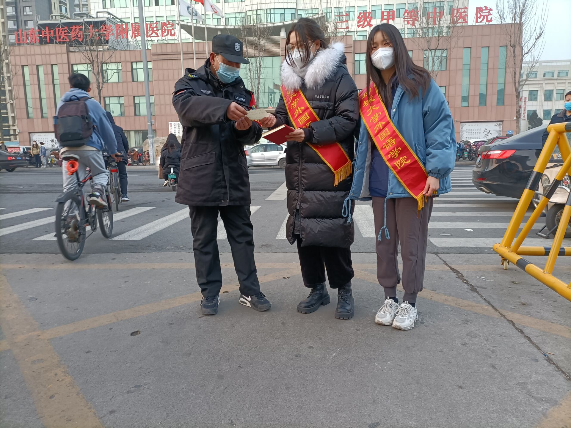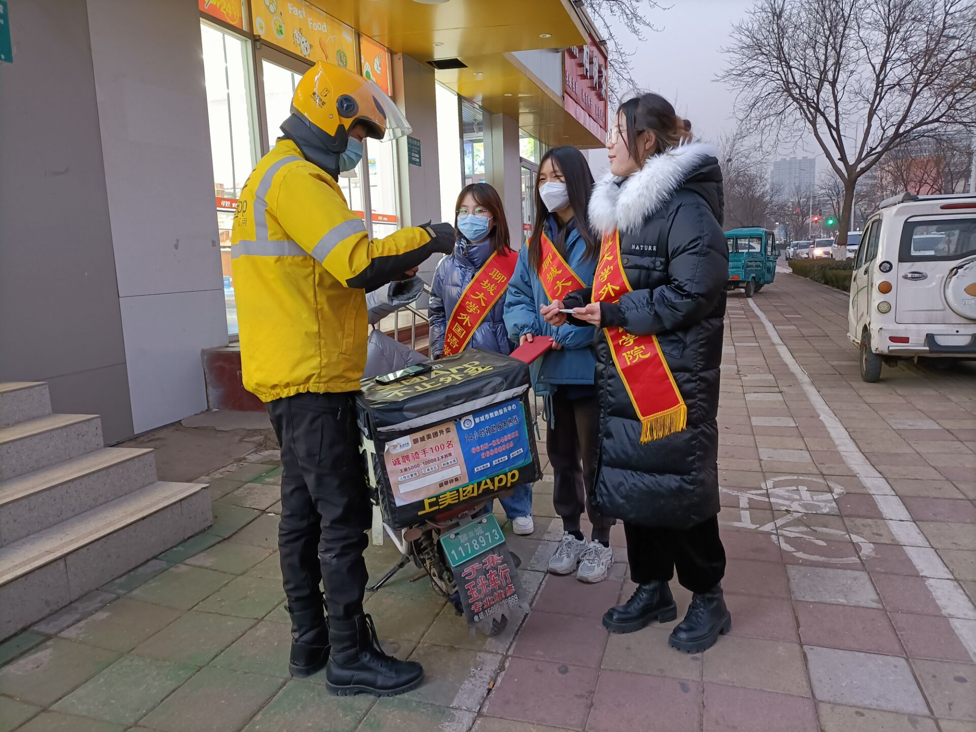 迎接着寒冬,怀揣着热情。活动开始前,青春筑梦服务队的队员们亲手制作了贺卡,并精心准备了小礼品,想通过自己的微薄之力,为身边的人送去温暖。包装好后,队员们集合在mkmksport北门出发,沿着马路开始寻找服务对象。活动过程中,成员们走近外卖小哥和门岗护卫,向他们表达了最真挚的感谢,并通过询问交流,了解到他们的日常工作与生活现状。无论寒冬还是酷暑,他们经常连续工作三四个小时甚至更久。队员们明白他们的付出与不易,并纷纷表示了对每位坚守岗位的人的敬意。随后,队员们积极将贺卡、小礼品与爱的拥抱送给每一位外卖小哥及门岗护卫,并对他们进行了慰问,希望在这寒冷的冬天能给他们带去一点融融暖意,而队员们与身边的人共同感受这短暂的温馨氛围,冬天的寒冷也在此刻全都化成了温暖。