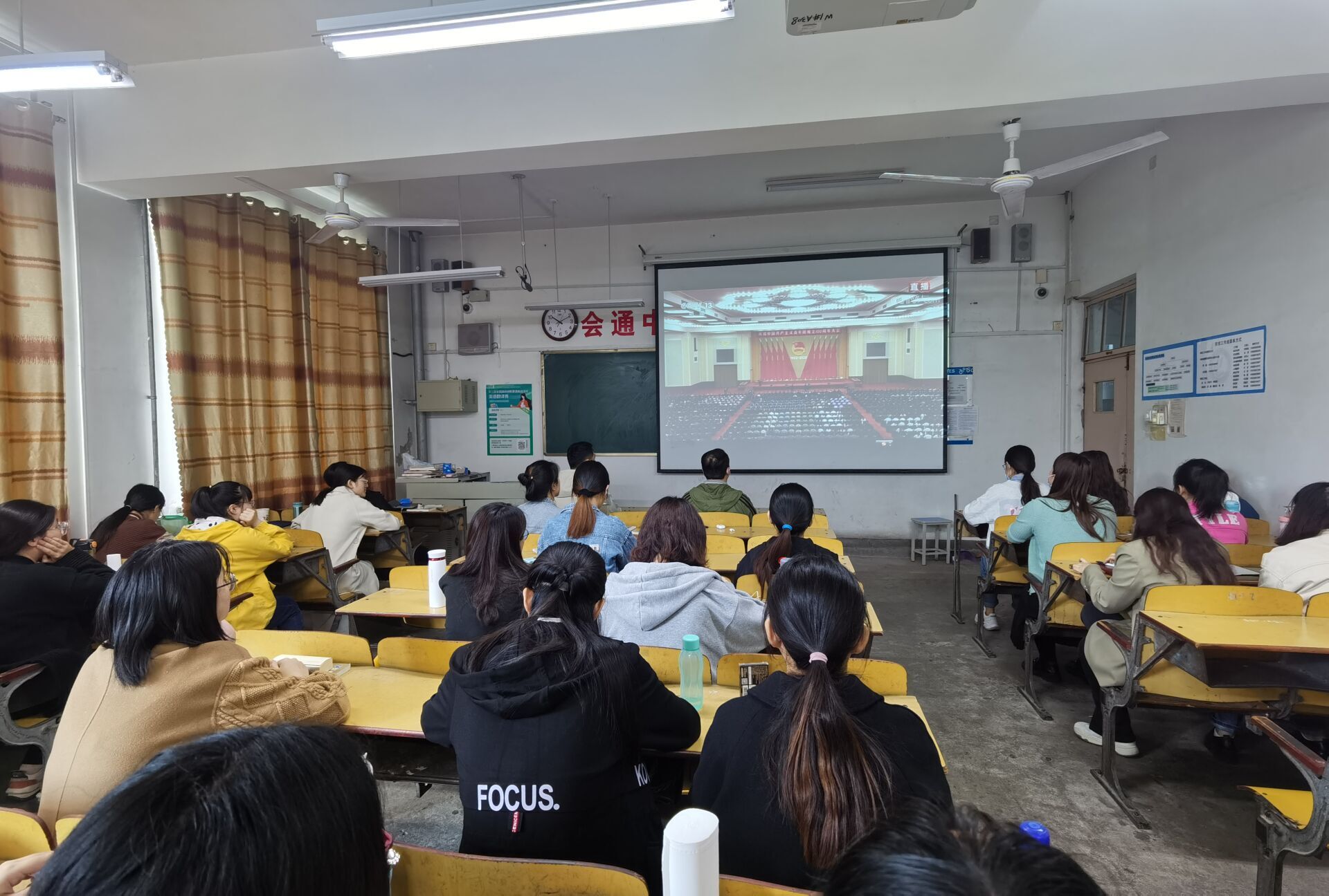 大会上,习近平总书记回顾了中国共产主义青年团的成立,表明每一位共青团员都与祖国命运息息相关,明确了共青团坚定不移跟党走,为党和人民奋斗的初心使命,肯定了不同社会发展时期共青团为祖国和人民做出的贡献。同时,习近平总书记鼓励广大共青团员要以党的领导为立身之本,坚守理想信念的政治之魂,奋进投身于民族复兴,在新的历史征程上再立新功。总书记也对共青团寄予厚望,希望共青团在未来坚持为党育人,自觉担当尽责,心系广大青年,勇于自我革命,团结带领广大团员青年成长为有理想、敢担当、能吃苦、肯奋斗的新时代好青年。在场学子聚精会神观看直播,体悟习近平总书记讲话背后蕴含的精神,明确自己的身上的责任担当,表明自己必将自身努力不断提高自身能力,不辜负祖国和人民的期待。