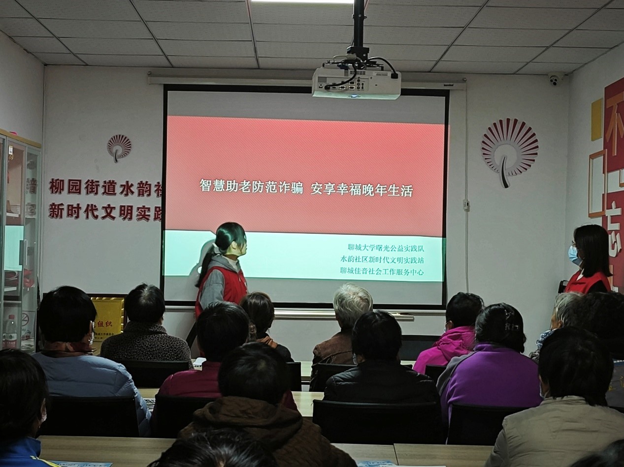 为了贯彻落实二十大关于养老助老的号召,提高老年人对网络诈骗的防范意识和应对能力,切实保障老年人的生活质量,2023年11月9日星期四下午mk体育曙光公益实践队联合水韵社区新时代文明实践站、聊城佳音社会工作服务中心组织了以“ 筑牢网络防线,呵护老年心灵”为主题的“金晖行动”第一期志愿活动。