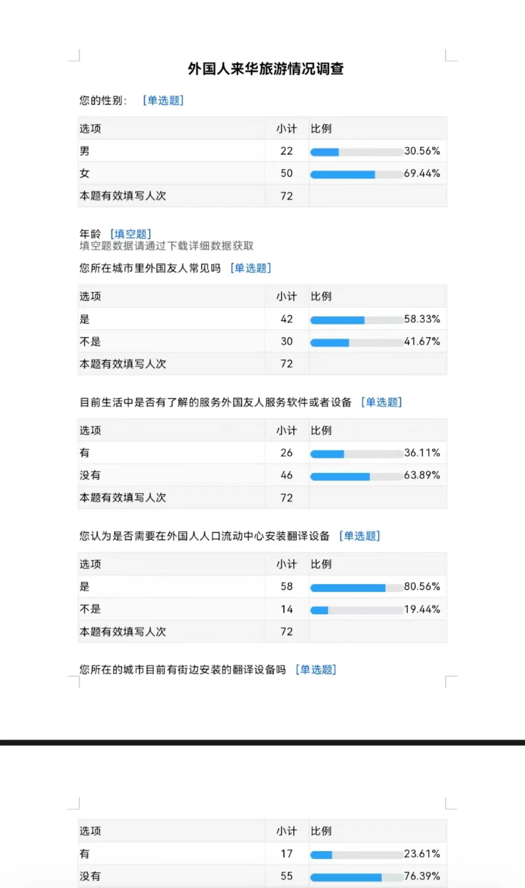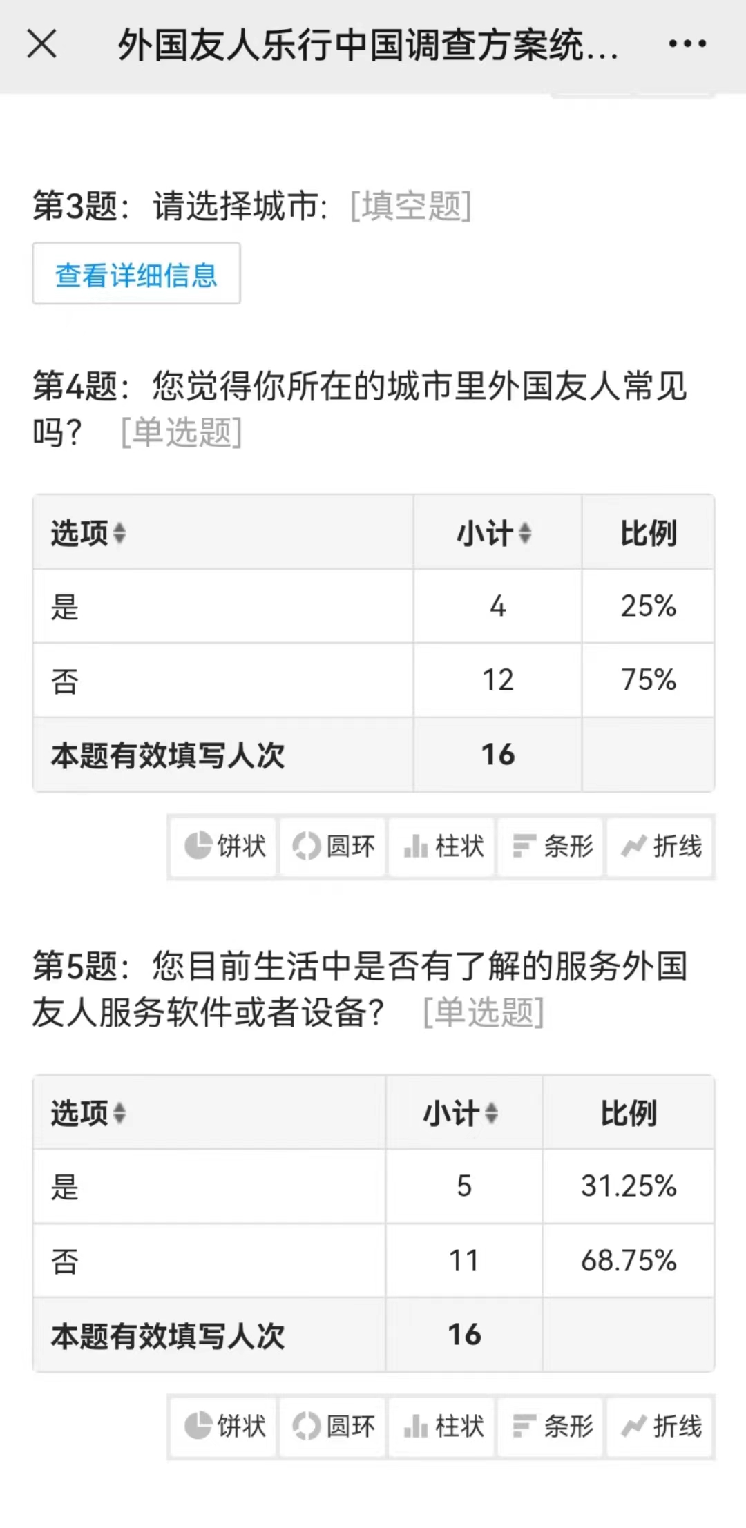 活动过程中实践团队通过线上调查问卷的形式了解身边的中国朋友对外国友人来华旅行的普遍性进行调研,为项目在市场前景与应用的评估提供更广泛的数据支撑;另外,为了更加深入地了解外国友人来华旅游和生活的切实需求,社会实践团队充分利用了互联网交流的便捷性,在抖音,微博等各大社交平台和在中国生活的外国友人进行线上交流,为项目内容的进一步完善提供更具体的信息支撑,同时,社会实践队伍也通过查阅资料的形式,来增加对此次调查了解。