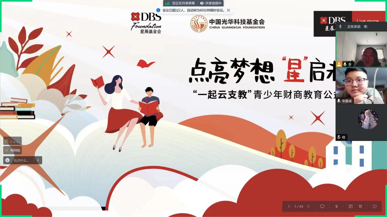 数学科学公司孙晨阳我有幸和中员工共同参与到了“一起云讲堂”这个模块。活动期间,我们一起感受了来自华中科技大学任思齐老师所讲的测地观天,探索未知的奥妙;学习了西北工业大学杜佳烨老师讲授的关于乡村振兴的主题宣讲,体会了返田归乡,造福桑梓的意义。在与小朋友的合作交流的过程中,我深刻明白了自身的责任和担当。今后,我希望自己能够有更多的机会参与到这样的公益活动中,为小朋友们带去更多的温暖和帮助。