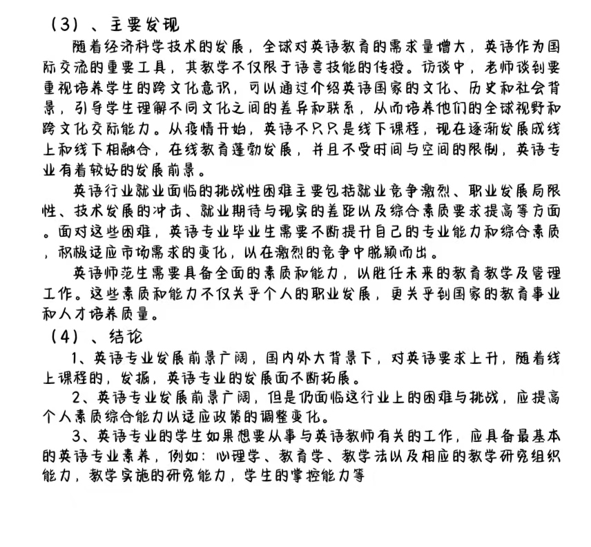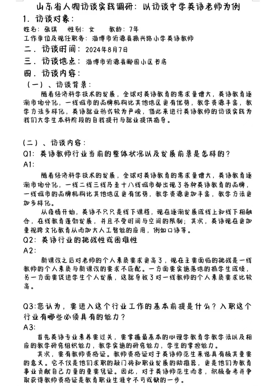 本次访谈,服务队邀请到临沂市沂源县英语教师张琪,作为英语专业毕业的张琪有着丰富的工作经验。在访谈过程中,服务队成员通过“英语专业就业前景如何?英语教师行业的挑战或困难有哪些?作为英语教师需要具备的基本素质或能力有什么?”三个问题进行提问并得到了张琪的深度解答。同时,在访谈中,张琪教师也分享了自己多年的教学心得。她表示,在全球化的背景下,社会对英语教师的需求是不减的,英语专业线上线下同步发展的前景十分广阔。张琪认为英语作为国际交流的重要工具,其教学不仅限于语言技能的传授,更重要的是培养员工的语言运用能力和跨文化交流能力,让员工能够综合地掌握英语知识。她还强调了教师自我提升的重要性。她认为,作为一名英语教师,必须不断学习新知识、新技能,以适应教育变革和员工需求的变化。此次访谈圆满结束。