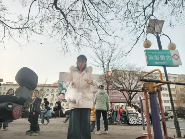 活动过程中,“暖阳行动”实践队全体成员手持垃圾袋和捡拾工具穿梭在社区的各个角落,对公园、街道、绿化带等区域进行了全面而细致的垃圾清理工作。尽管室外寒冷,但实践队的成员们不畏严寒,不怕脏累,怀揣着高度的责任心和使命感,认真搜寻着每一个角落的垃圾,无论是微小的烟蒂、纸屑,还是随风飘落的塑料袋,都被一一捡到垃圾袋中,再分类投放至垃圾桶内。此外,实践队还精心准备了环保标语横幅和宣传册,通过悬挂标语横幅、发放宣传册等方式,向社区居民普及环保知识,并讲述低碳生活、绿色出行等环保理念,进一步增强了社区居民的环保意识。