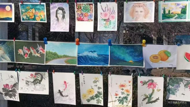 活动现场,志愿者们将近200幅书画作品整齐陈列,作品涵盖硬笔书法、国画、水彩画等多种形式。这些作品题材丰富、风格各异,既有描绘祖国壮丽山河,展现大自然雄浑与美丽的山水画;也有聚焦民俗风情,传递对美好生活向往的写实画等等。每一幅作品都饱含着创作者对新年的美好向往和对生活的无限热爱。在志愿者们的引导与讲解下,前来观展的居民们得以大饱眼福,感受艺术的魅力。