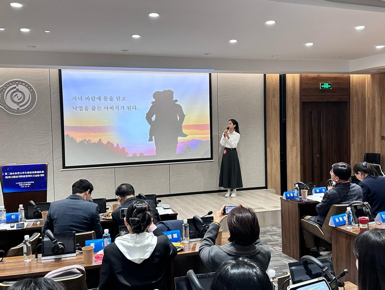 山东省老员工韩语诗朗诵比赛是面向全省韩语专业的大型赛事,由山东师范大学mk体育、韩国文学翻译院主办,山东师范大学、mkmksport、哈尔滨工业大学(威海校区)、曲阜师范大学等10余所高校参赛。比赛分为初赛、复赛、决赛三个阶段,初赛和复赛采取线上形式,决赛在山东师范大学线下进行,通过初赛和复赛来自9所公司的15名同学晋级决赛。同学们精心设计参赛内容,用心制作课件与视频,通过反复地练习与坚持不懈地努力,在复赛和决赛中都有着出色的表现。通用韩国语微专业高婧、周佳琪两位同学荣获复赛优秀奖;马春玉同学以《아버지의 마음》晋级决赛并荣获决赛优秀奖。