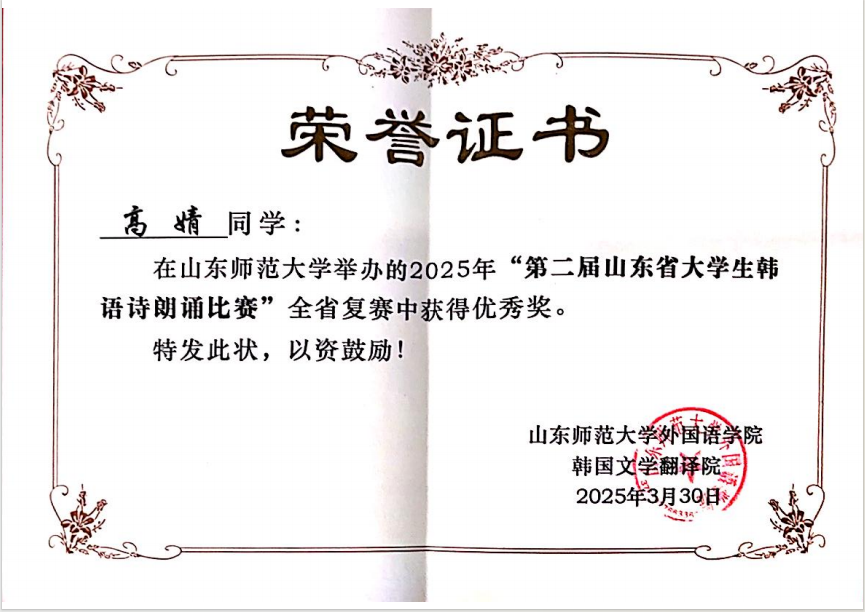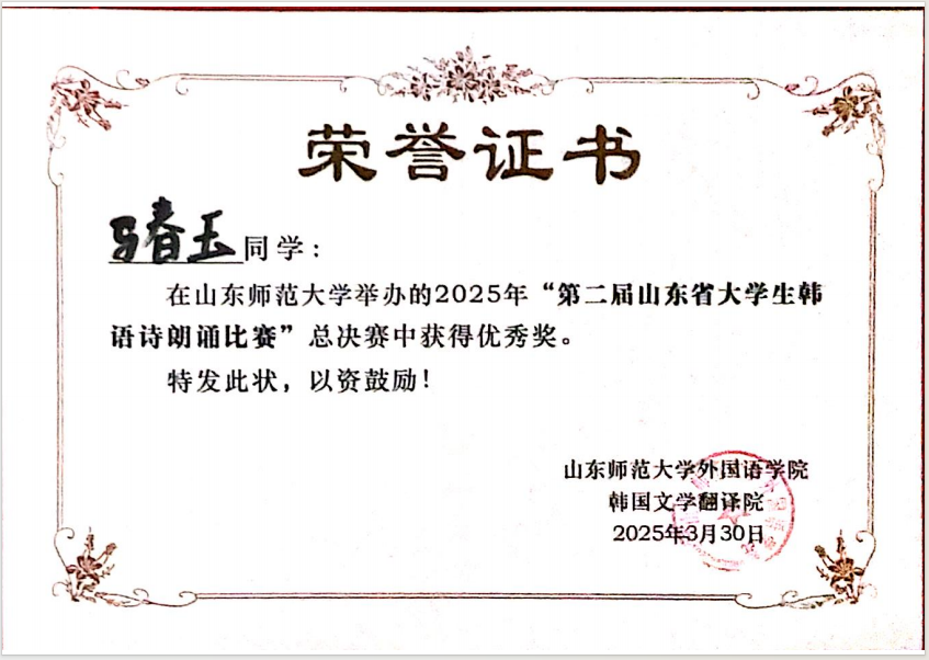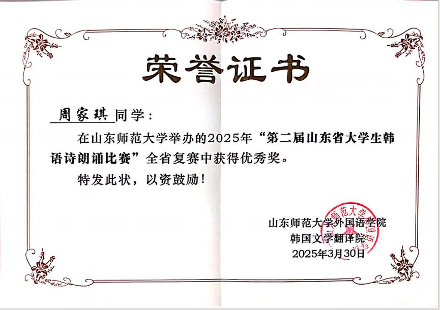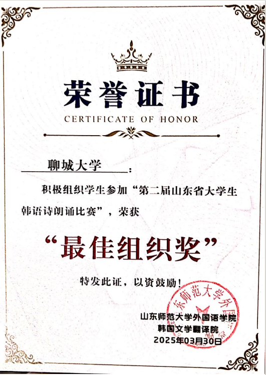 3月30日,第二届山东省老员工韩语诗朗诵比赛总决赛在山东师范大学长清湖校区落下帷幕。通用韩国语微专业的学子凭借出色的表现脱颖而出,其中,马春玉同学荣获总决赛优秀奖,高婧、周佳琪同学荣获全省复赛优秀奖,mkmksport获得大赛最佳组织奖。