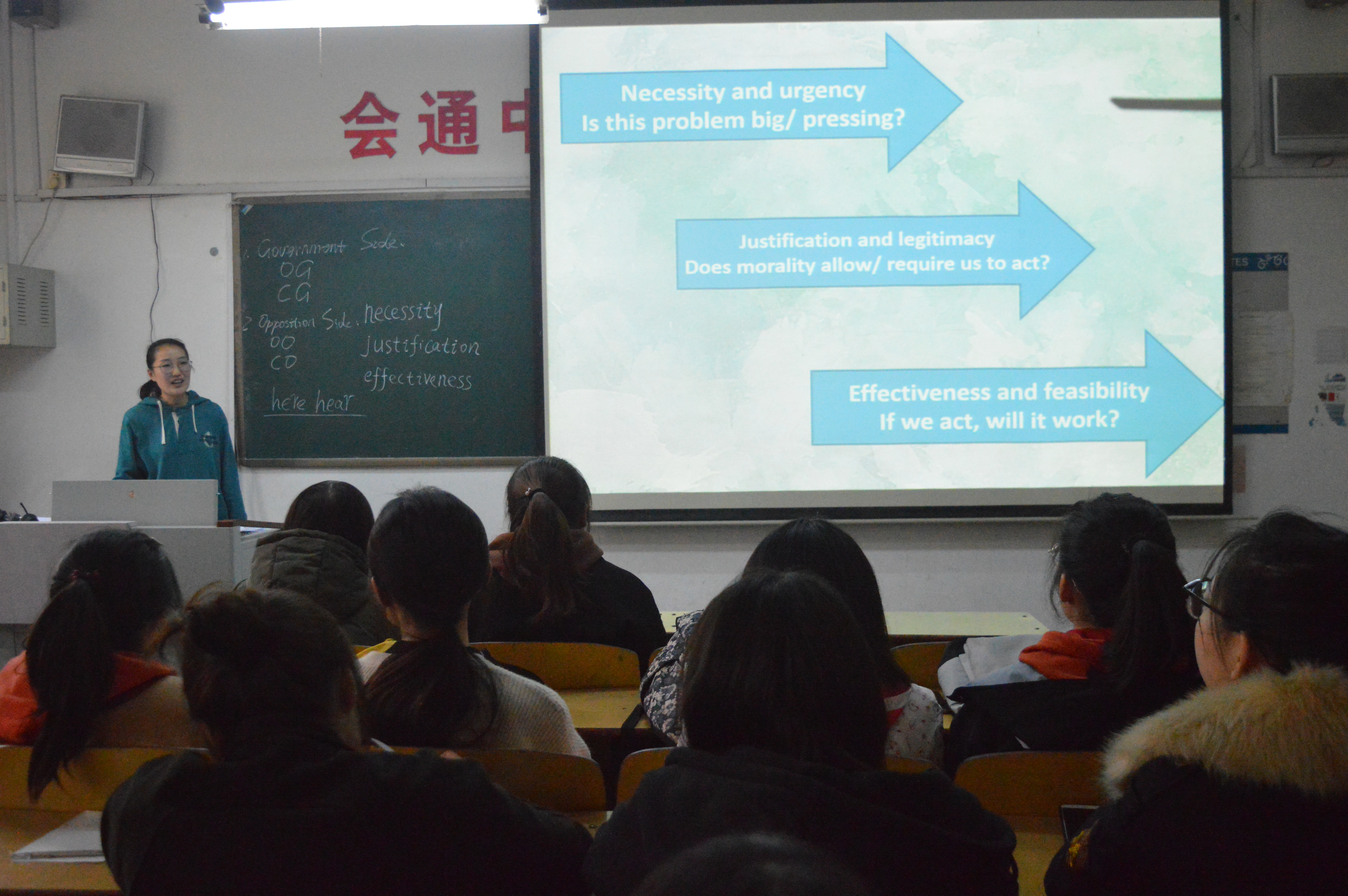 张慧老师首先为大家介绍了此次“外研社杯”全国老员工英语辩论赛的参赛背景以及比赛情况,她对孙毓、郭晓睿两位同学在比赛中的精彩表现给予了高度赞扬,并指出:“这次两位同学在比赛中的优异表现不仅得益于公司历年来在教学工作上进行不断的改革,更离不开各位领导的关注支持的和教师们的辛勤付出。”随后,她通过视频和图片,对BP辩论赛规则与评判标准进行了详细的讲解,并分析了往届辩论赛辩题。不仅让同学们见识到了辩论赛的难度与挑战,同时也点燃了同学们对辩论赛向往的激情。