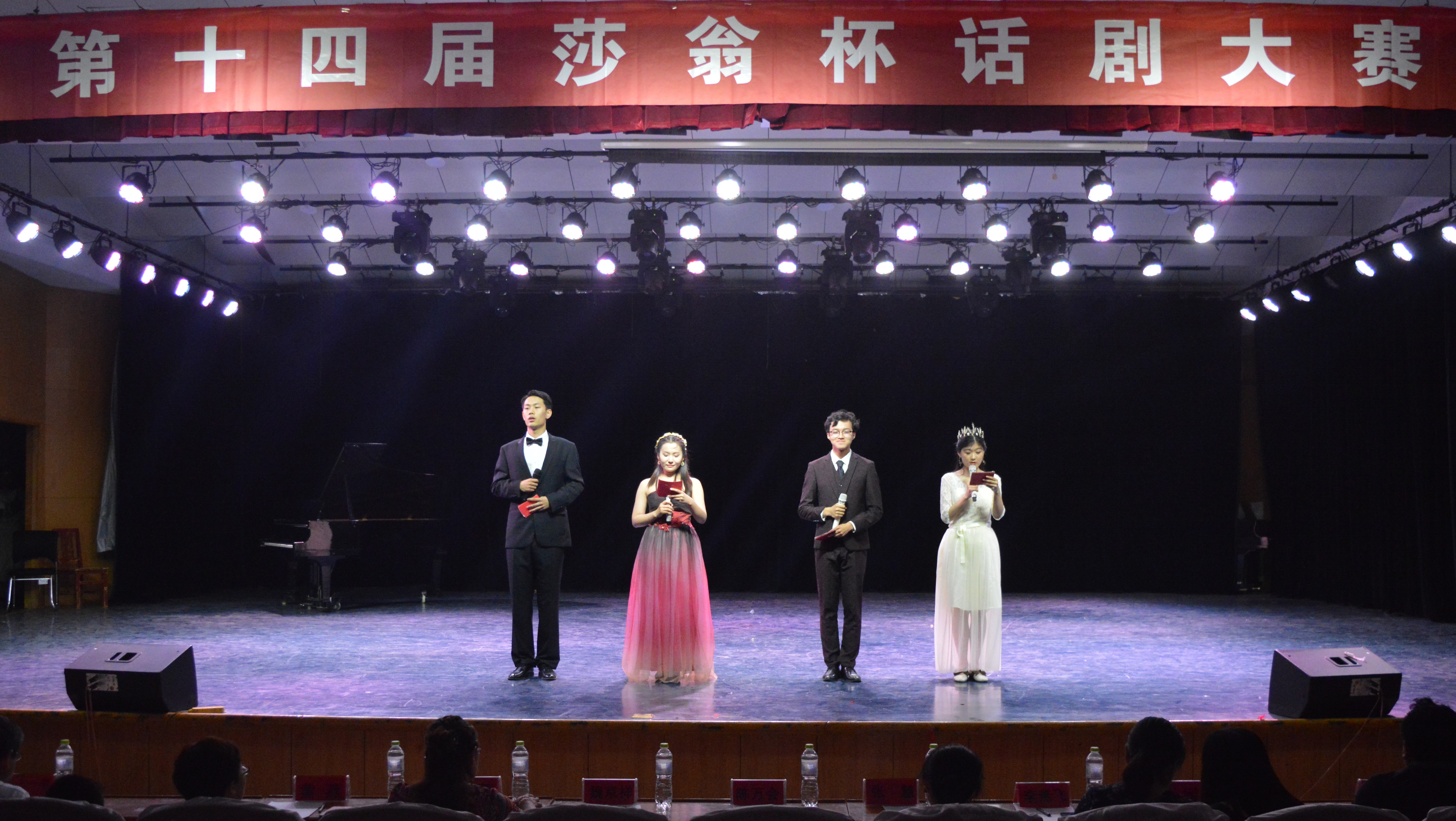 莎士比亚作为文艺复兴时期英国最杰出的戏剧家和诗人,作品广为流传,一批批优秀的改编作品的诞生,使我们对英式悲喜剧有了更多层次的了解。赛场上,高手云集,比赛精彩纷呈。经过初赛的层层选拔,九支参赛队伍脱颖而出,为大家带来了一场集视觉、听觉上为一体的饕餮盛宴。西班牙语版的《罗密欧与朱丽叶》,以不一样的语言风格,演绎了一段凄美的爱情故事。 同学们努力把握、理解好每个角色,将肢体动作、台词、语气刻画的淋漓尽致。同学们感情细腻、声情并茂,现场观众热烈的掌声和喝彩声此起彼伏,震耳欲聋。莎士比亚的经典之作《仲夏夜之梦》,经2017级与2018级两支英语组队伍的表演,达到了同一故事两种不同的演绎效果,向大家展现了话剧的多种表现形式,钢琴之声与小提琴的旋律交相辉映,让人们仿佛回到了那个充满艺术气息的时代。莎士比亚戏剧诗意的浪漫精髓在演员们的精彩表演中得到充分演绎。简单的道具和朴素的服装遮挡不住表演者们出色的表演,震撼的视觉和情感冲击带给观众极大的艺术享受。