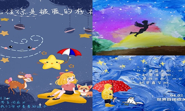 万物皆有裂痕,那是光进来的地方。人们常说,上帝为你关上了一扇门,那他也会给你打开一扇窗,而自闭儿童的“窗”就是画笔,每一位自闭儿童都善于和自己画画,或许这就是“星星的孩子”特有的交流方式。本次线上活动中,征集到了很多的绘画作品,同学们用一幅幅精美的手绘画为自闭症儿童诠释了“星星的孩子不孤独”。在收集的绘画作品中,同学们用自闭儿童的代表色蓝色点缀出了一幅幅浩瀚的星空,星空里住着美丽的天使,而每一位天使的伞下都有一个活泼可爱的孩子,这些孩子便是“星之守护者”,同学们用天使守护的绘图向自闭儿童表达出了最真诚的关爱之情。在本次线上活动结束后,同学们的作品以邮件的形式被发送给了有自闭症儿童的家庭,并向他们传达了问候和祝福,希望他们能够真正的被关注、被关爱,不再孤单!