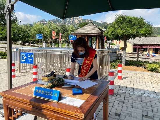 活动开始前,服务队成员们进行了充分的疫情防控准备工作。如配备口罩、测温仪等防护物品,还有洗手液、消毒水、酒精等消毒用品,确保满足防控疫情和开放景区工作的需要。活动期间,在当地景区工作人员的协助和支持下,同学们积极辅助景区工作人员测量游客体温,查看游客的健康码,并为未佩戴口罩的游客提供口罩和清洁用品,严格落实实名制扫码入园的制度,做好游客信息登记工作。同时,同学们还为游客发放自制的疫情防控知识手册,并通过细致的讲解,向人们传达当前疫情形势的严峻性和紧迫性,使人们以谨慎的态度对待当前疫情。精美的宣传手册和全面深入的讲解,激发了人们的参与度和热情,得到了人们的一致称赞和支持。
