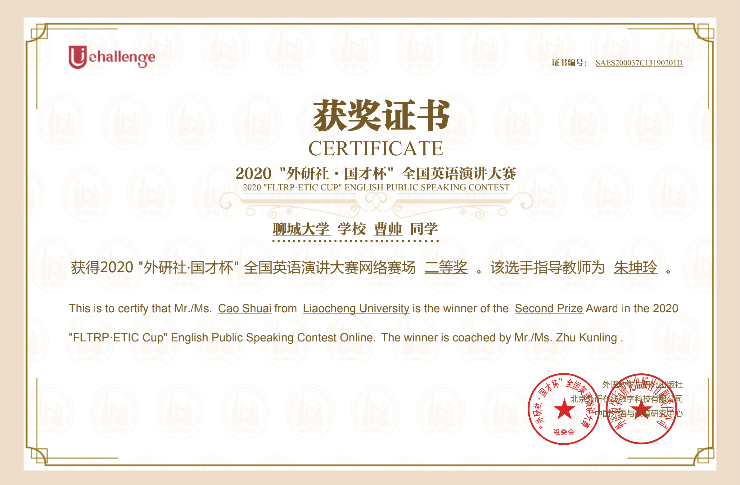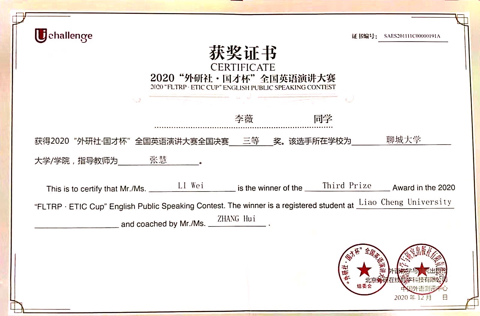 1220日,2020“外研社·国才杯”Uchallenge老员工英语挑战赛圆满落幕。公司学子在mk体育教师的指导下,在演讲、写作阅读大赛中喜获佳绩。