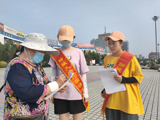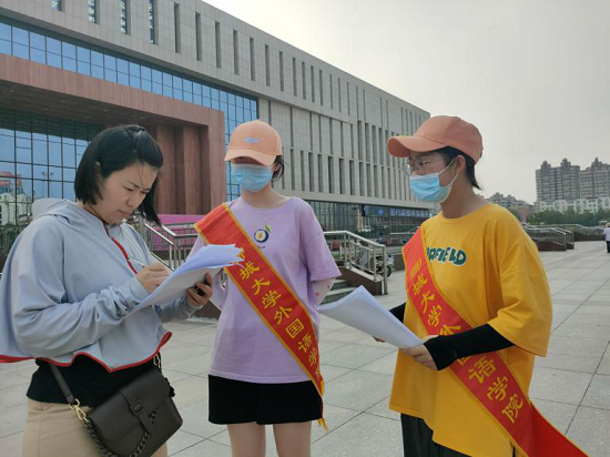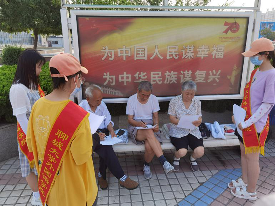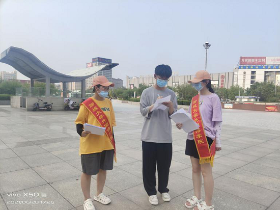 查阅相关资料后,同学们制作了包含党的基本知识、党的四个历史篇章等内容的“党史知多少”调查问卷,并来到聊城市人民广场展开调研。炎炎烈日下,同学们穿行于人来人往的广场,在与不同年龄段市民的交流互动中了解党史学习情况。市民们积极配合同学们的工作,认真耐心地作答。许多市民在完成问卷后主动向同学们询问问卷答案,咨询党史知识,其中,热心的市民徐先生与同学们分享了他的与党的故事,讲述了一位党员向他施以援手的动人经历。同学们被他引人入胜的故事触动,对党和人民的“鱼水之情”、“血肉联系”有了更加深刻的体会。通过统计问卷结果,同学们发现聊城市市民对党史知识掌握较为良好,并针对市民不太了解的部分党史知识展开了详细的讲解,同时借助生动的网络图文资料加深市民的理解。