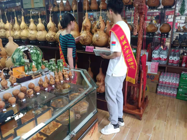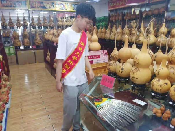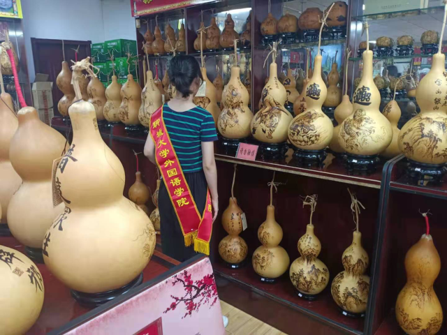 活动当天,旭日服务队成员通过网络查询了关于葫芦的相关知识,对葫芦有了大致的了解后成员们出发前往古城,在古城中找到了一家葫芦坊,征得老板的同意后入内进行参观。葫芦坊内陈列着许多造型各异,图案精美的葫芦,还有专门的工匠师傅正在进行雕刻。随后在工作人员的带领和讲解下,成员们了解到东昌葫芦对于葫芦的选择十分考究,其雕刻工序复杂精细,大体有三道程序——制胚、雕刻、着色,是一种融书法、绘画、篆刻于一体的艺术,在日常生活中不仅有美化和装饰的作用,还蕴含着“福禄”这一吉祥寓意。之后,在与工作人员交谈中,成员们发自内心地感受到了雕刻师的工匠精神,领略了东昌葫芦的艺术之美。
